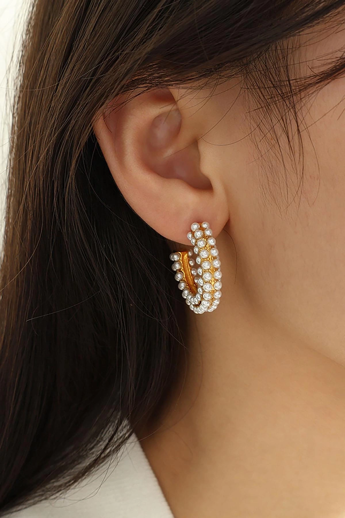 Altın Renk İnci Detaylı Halka Küpe (Çift)