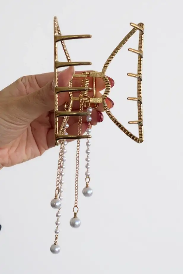 Altın Renk Kelebek Figürlü İnci Detaylı Sallantılı Metal Mandal Toka