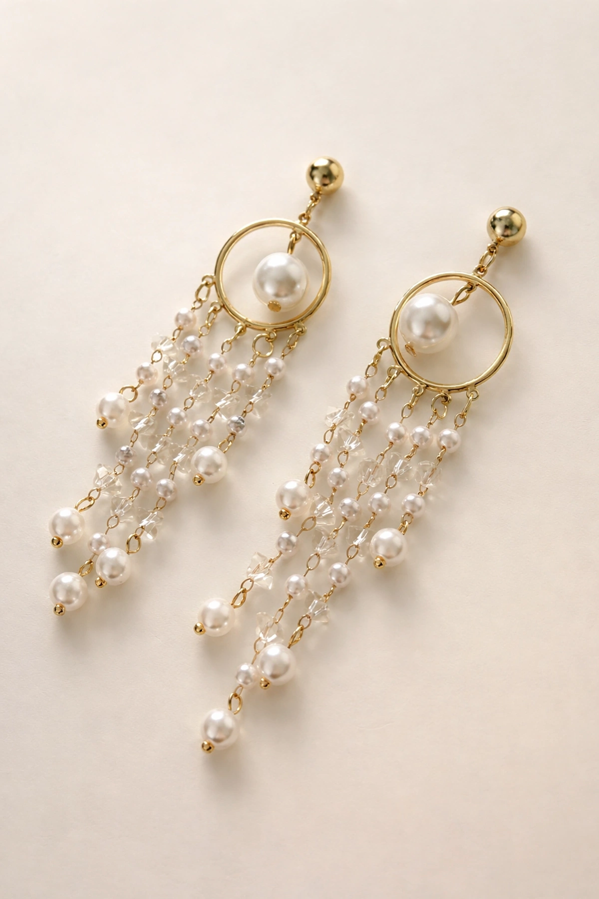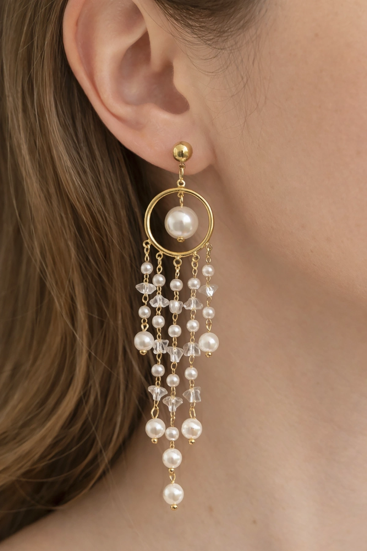 Altın Renk İnci Detaylı Sallantılı Küpe (Çift)