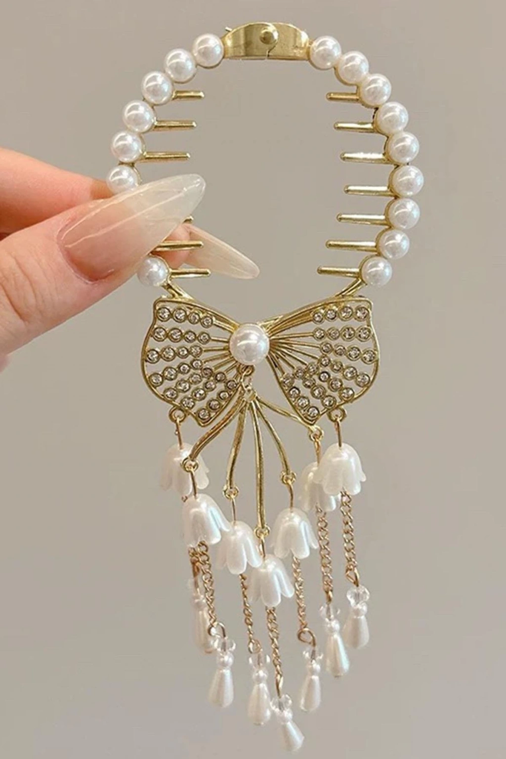 Altın Renk Kurdele Figürlü İnci Detaylı Topuz Tokası