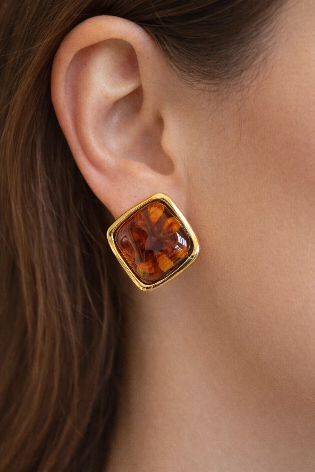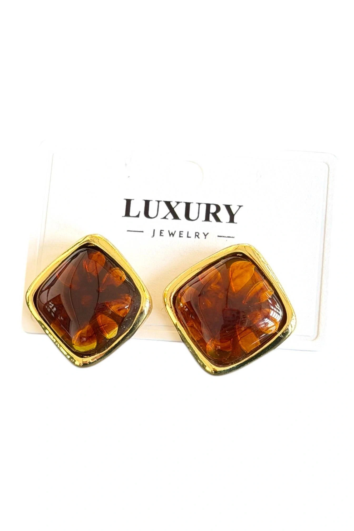 Altın Renk Kahverengi Taş Detaylı Küpe (Çift)