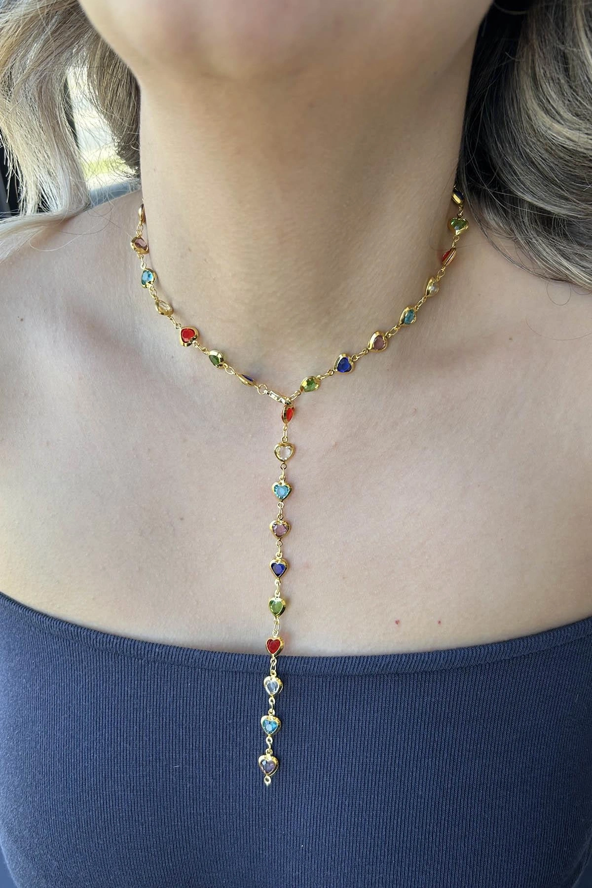 Altın Renk Kalp Detaylı Renkli Taşlı Çelik Y Kolye