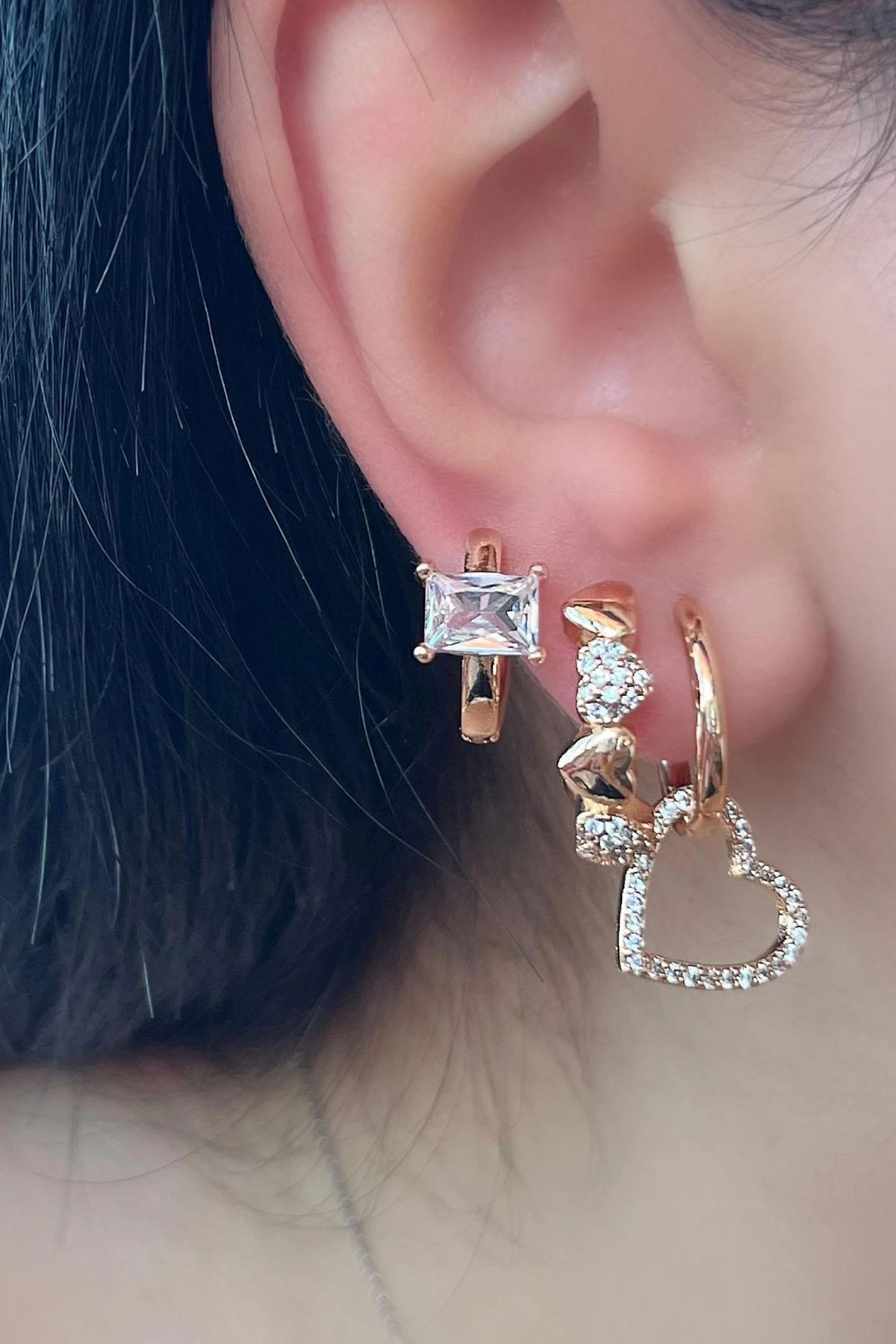 Altın Renk Kalp Detaylı VİP 3'lü YSX Küpe Set