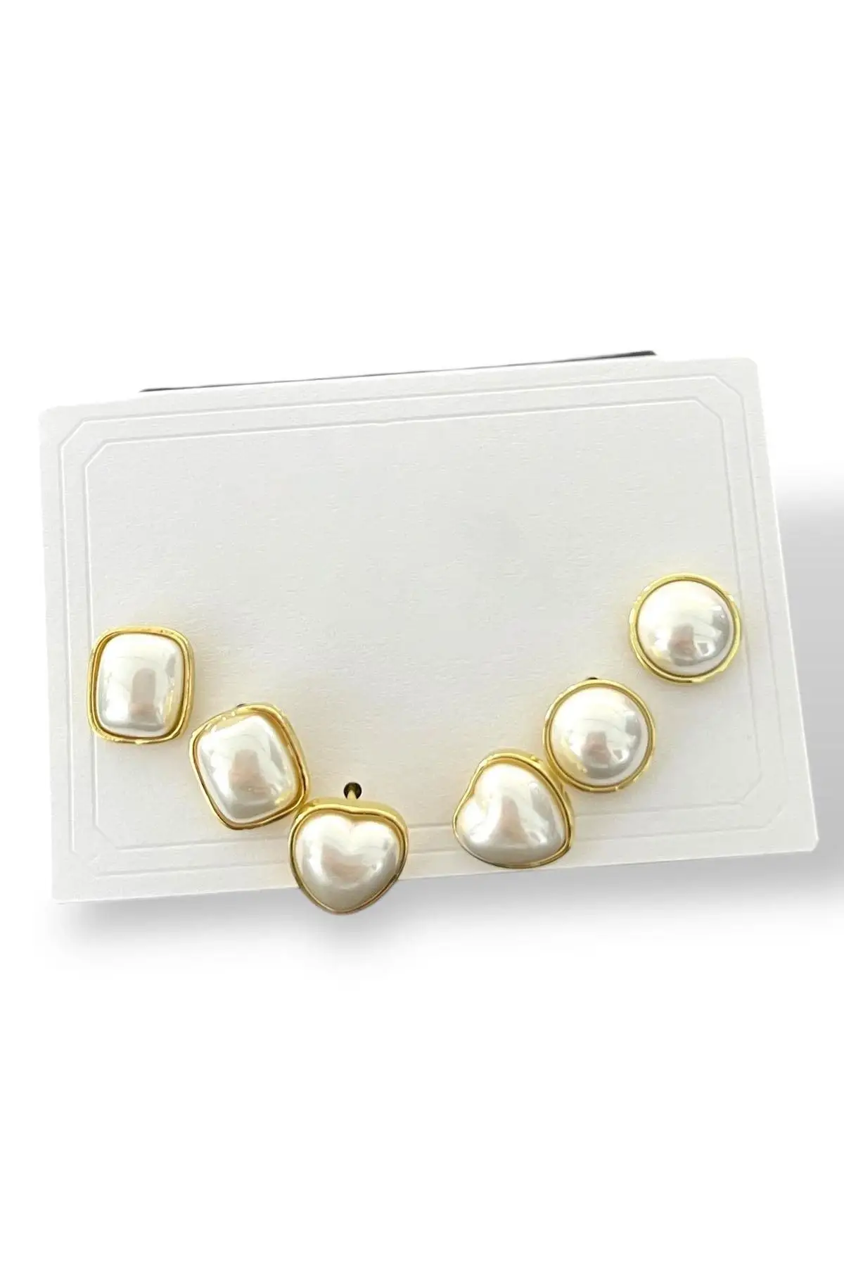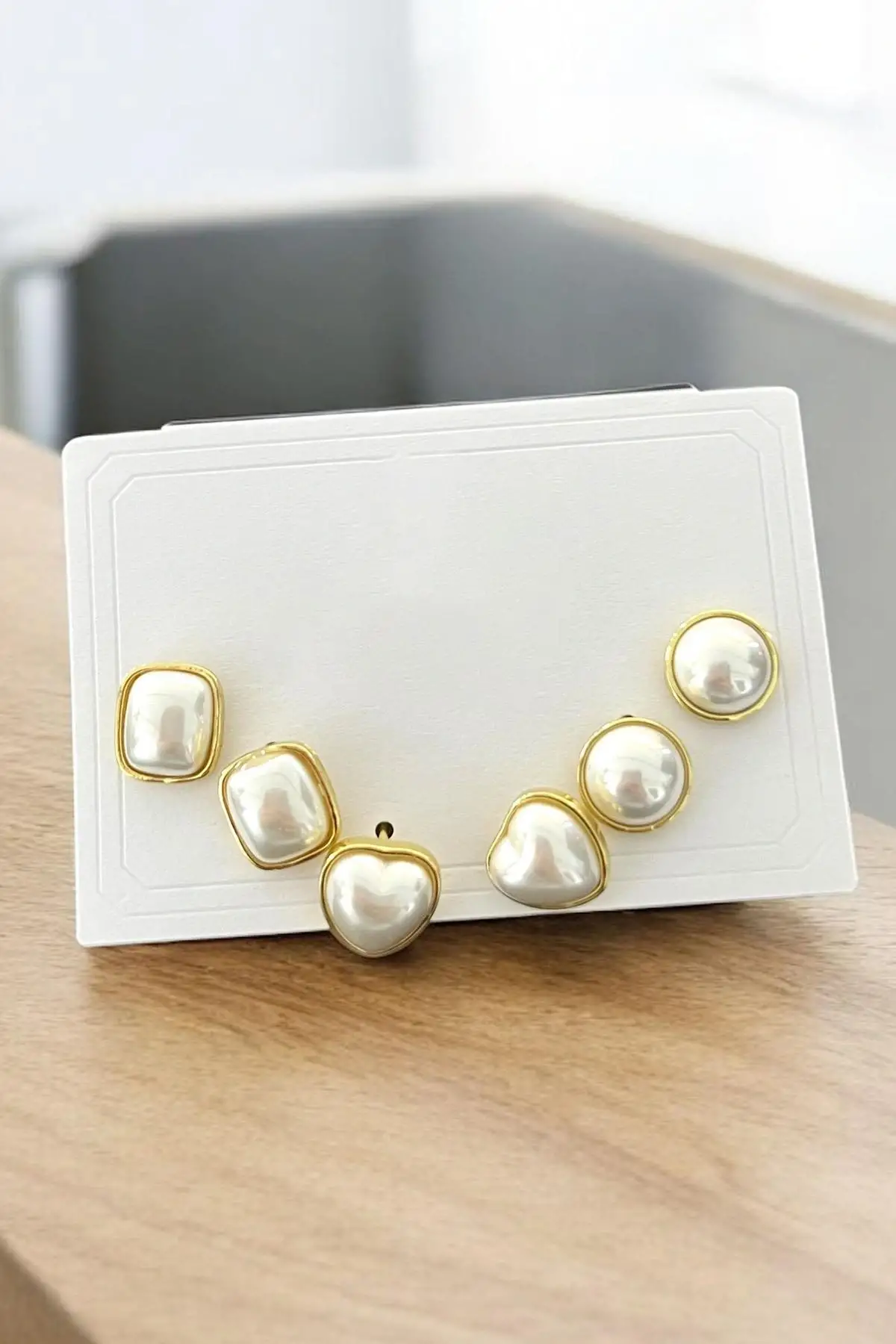 Altın Renk Kalp Figürlü İnci Detaylı 6'lı Küpe Set