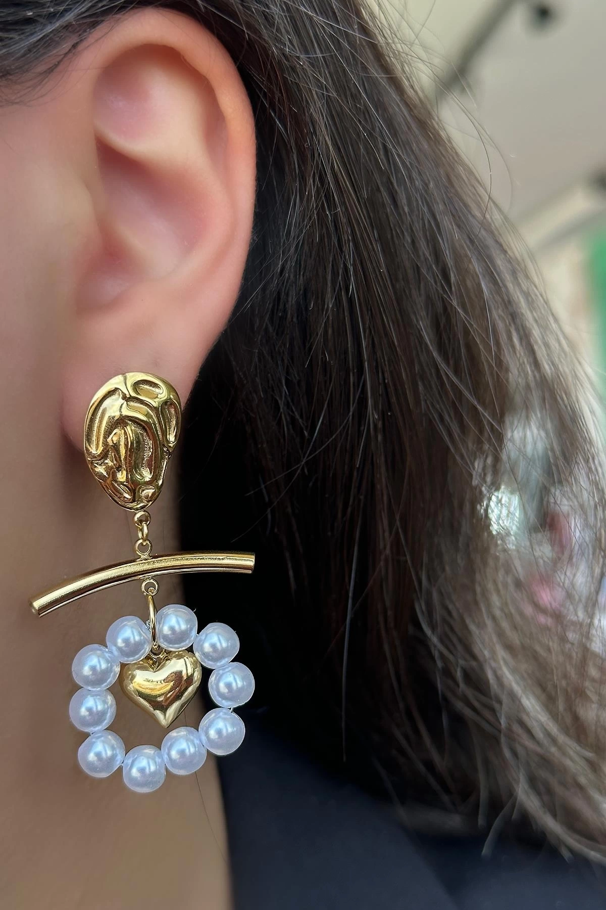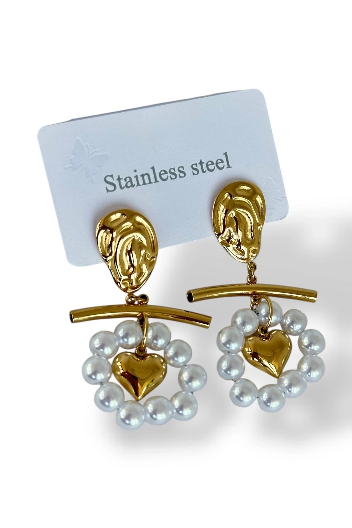 Altın Renk Kalp Figürlü İnci Detaylı Çelik Küpe (Çift)