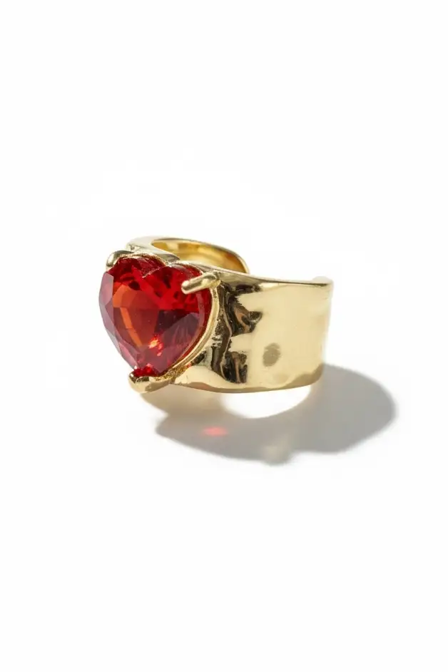 Altın Renk Kalp Figürlü Kırmızı Taş Detaylı 14K Altın Kaplama Ear Cuff (Tek)