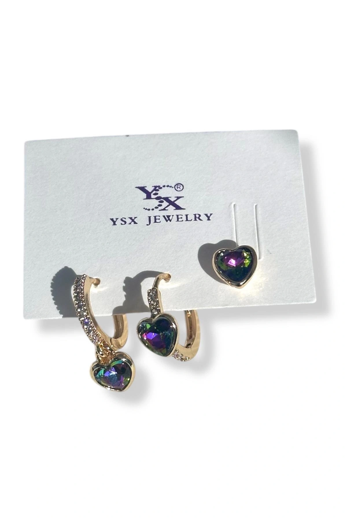 Altın Renk Kalp Figürlü Taş Detaylı 3'lü YSX Küpe Set