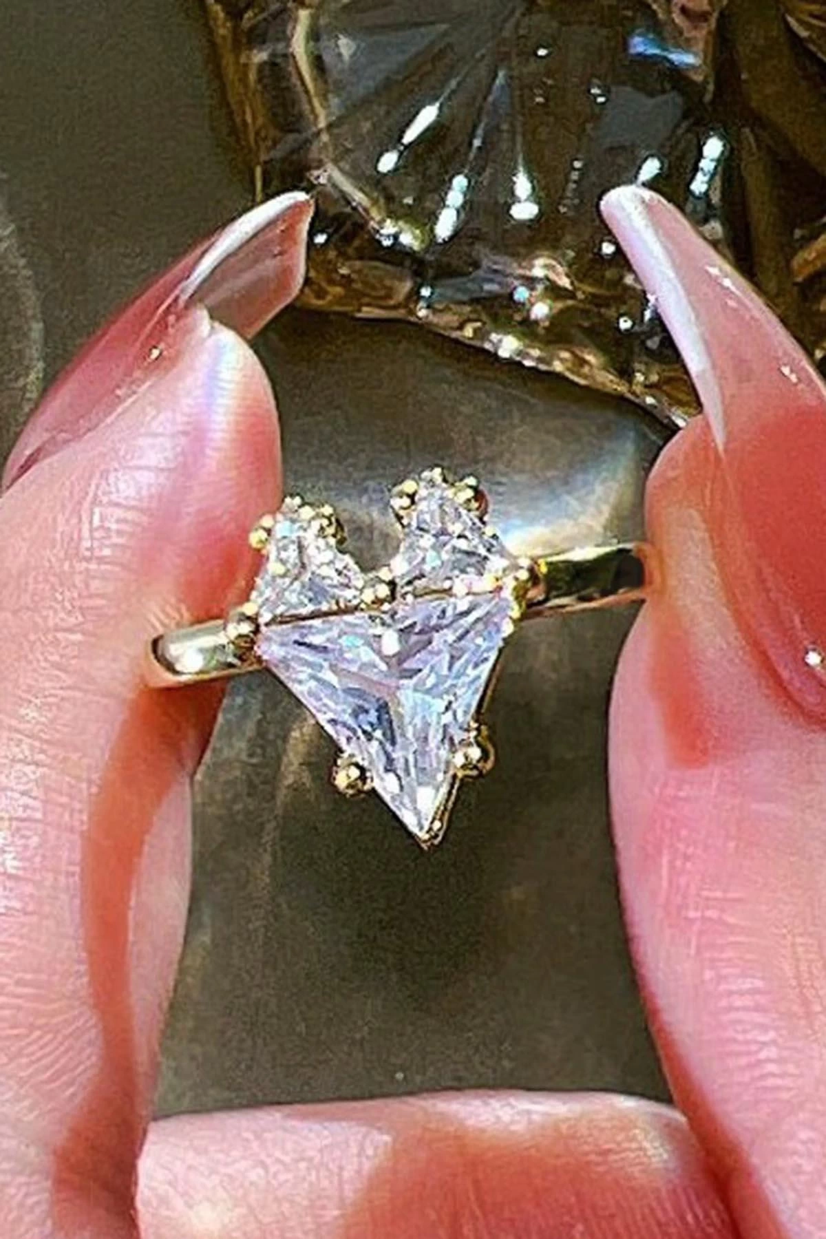 Altın Renk Kalp Figürlü Taş Detaylı Ayarlanabilir Yüzük