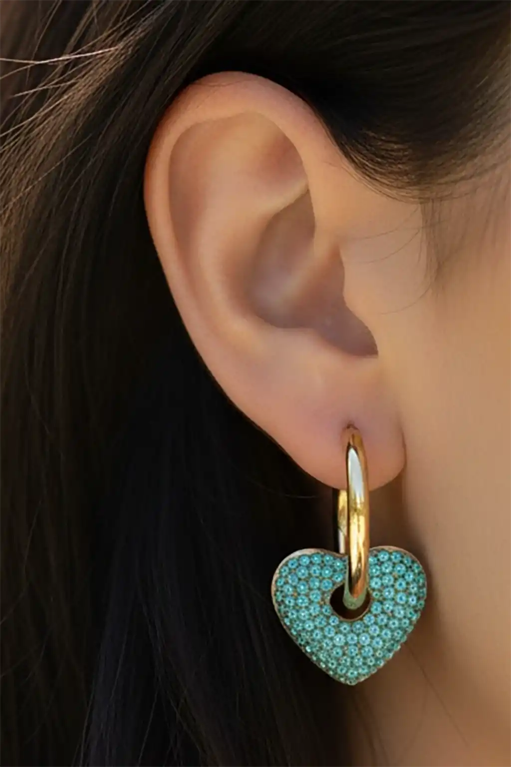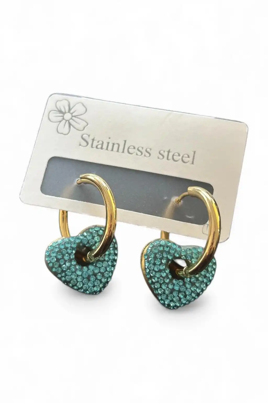 Altın Renk Kalp Figürlü Taş Detaylı Çelik Küpe (Çift)