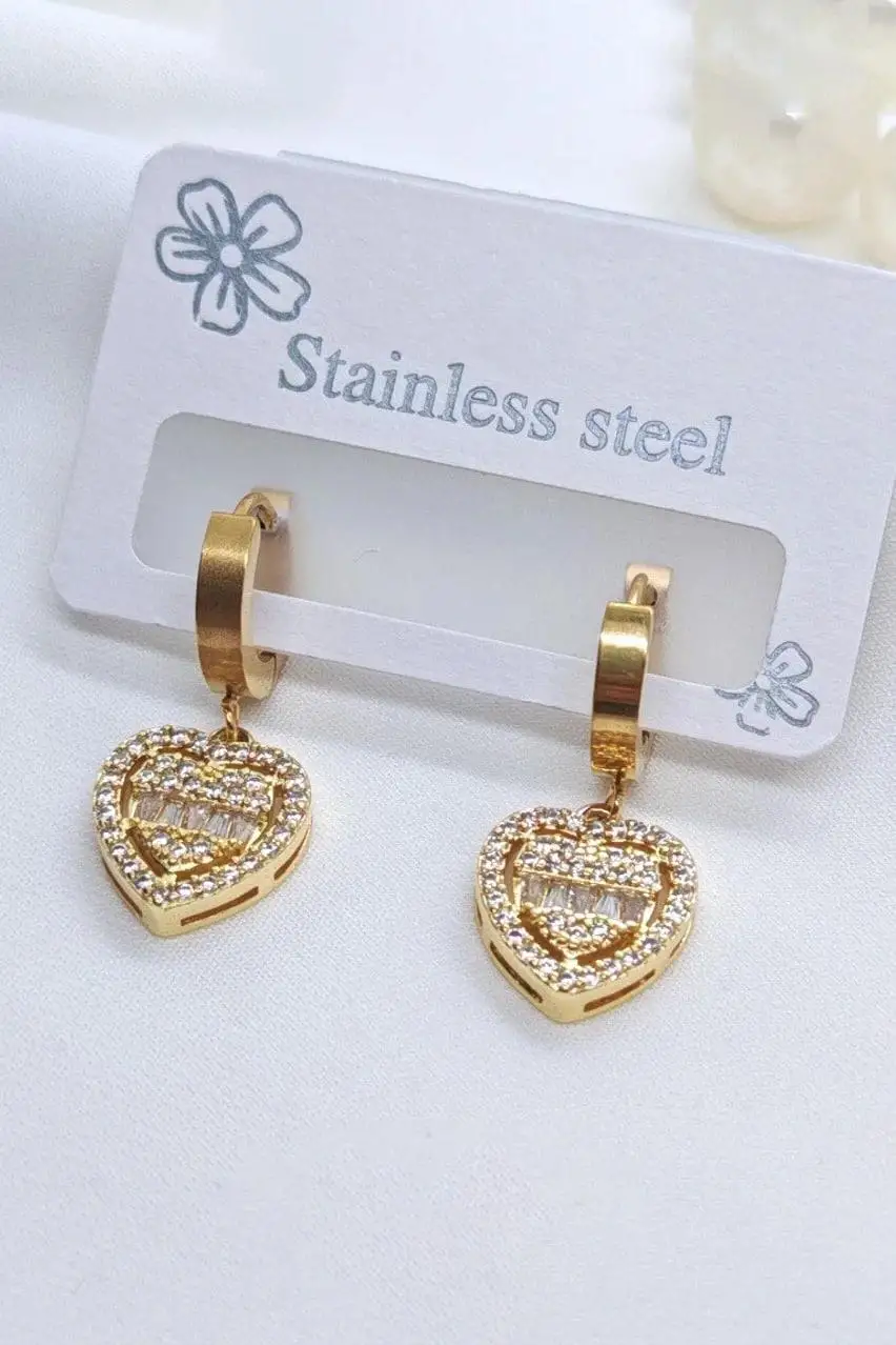 Altın Renk Kalp Figürlü Taş Detaylı Çelik Küpe (Çift)
