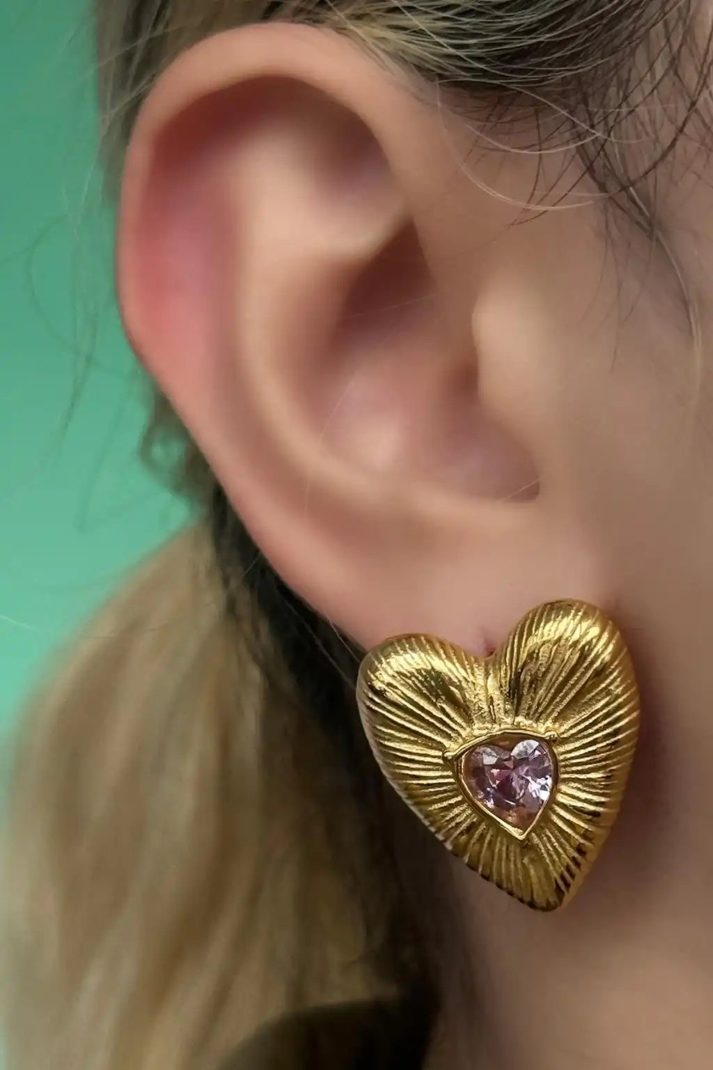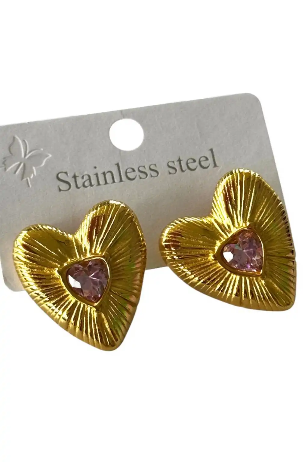 Altın Renk Kalp Figürlü Taş Detaylı Çelik Küpe (Çift)