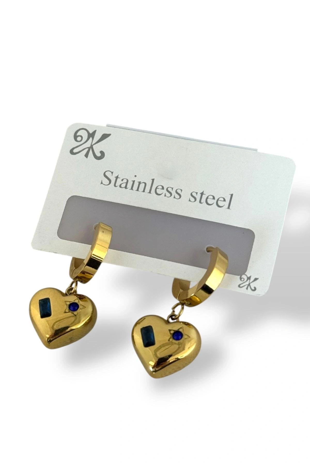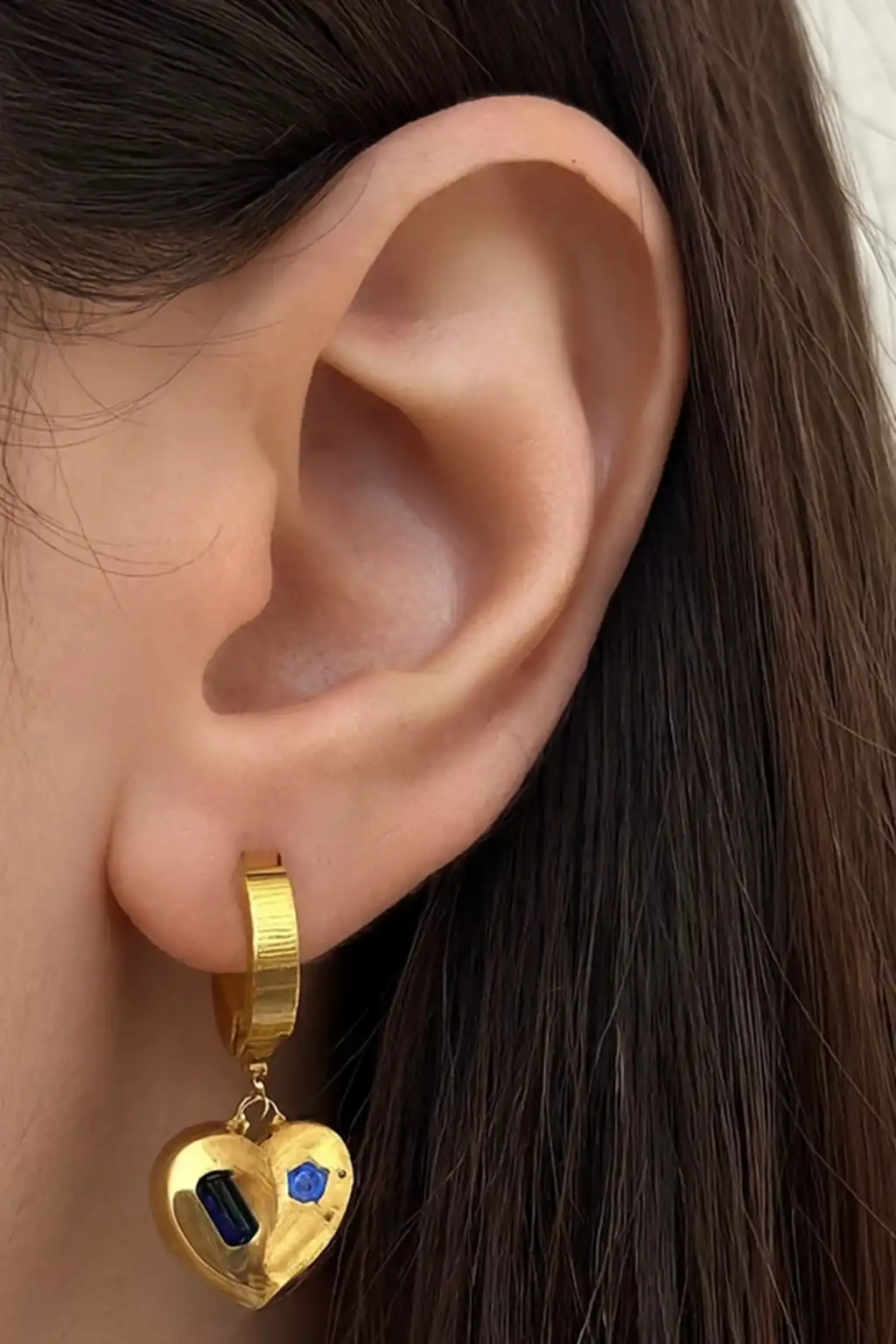 Altın Renk Kalp Figürlü Taş Detaylı Çelik Küpe (Çift)