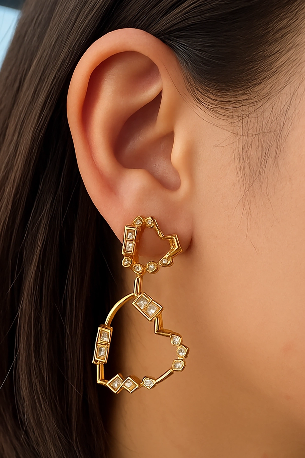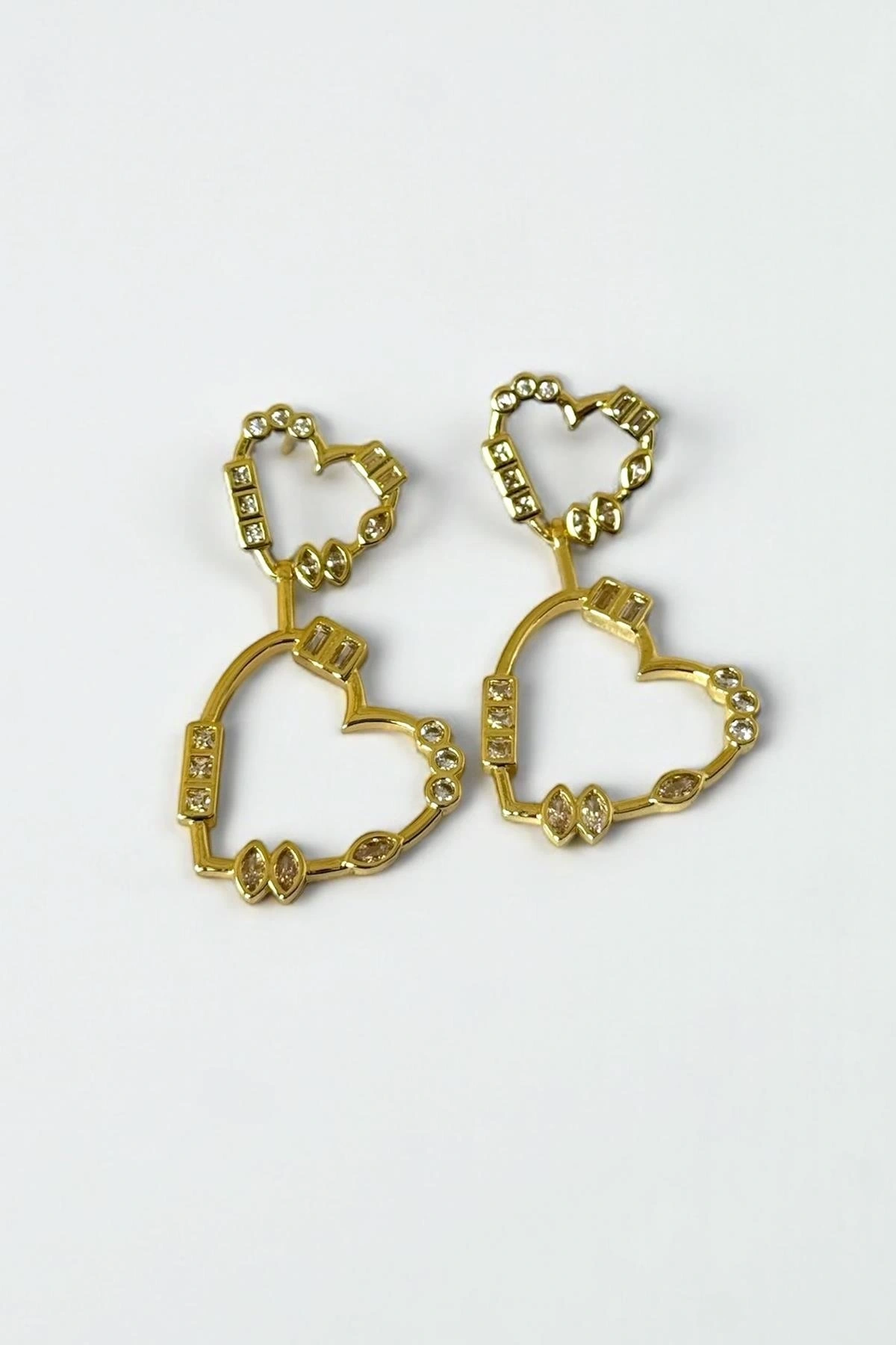 Altın Renk Kalp Figürlü Taş Detaylı Küpe (Çift)