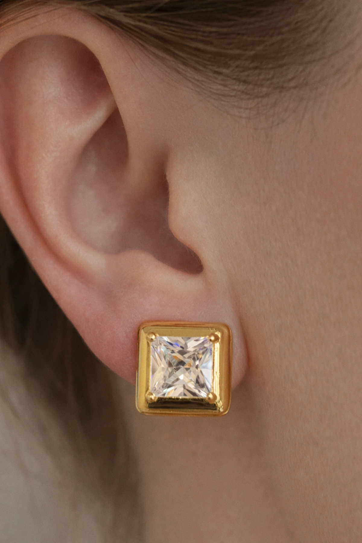 Altın Renk Kare Detay Taşlı 14K Altın Kaplama Tx Küpe (Çift)