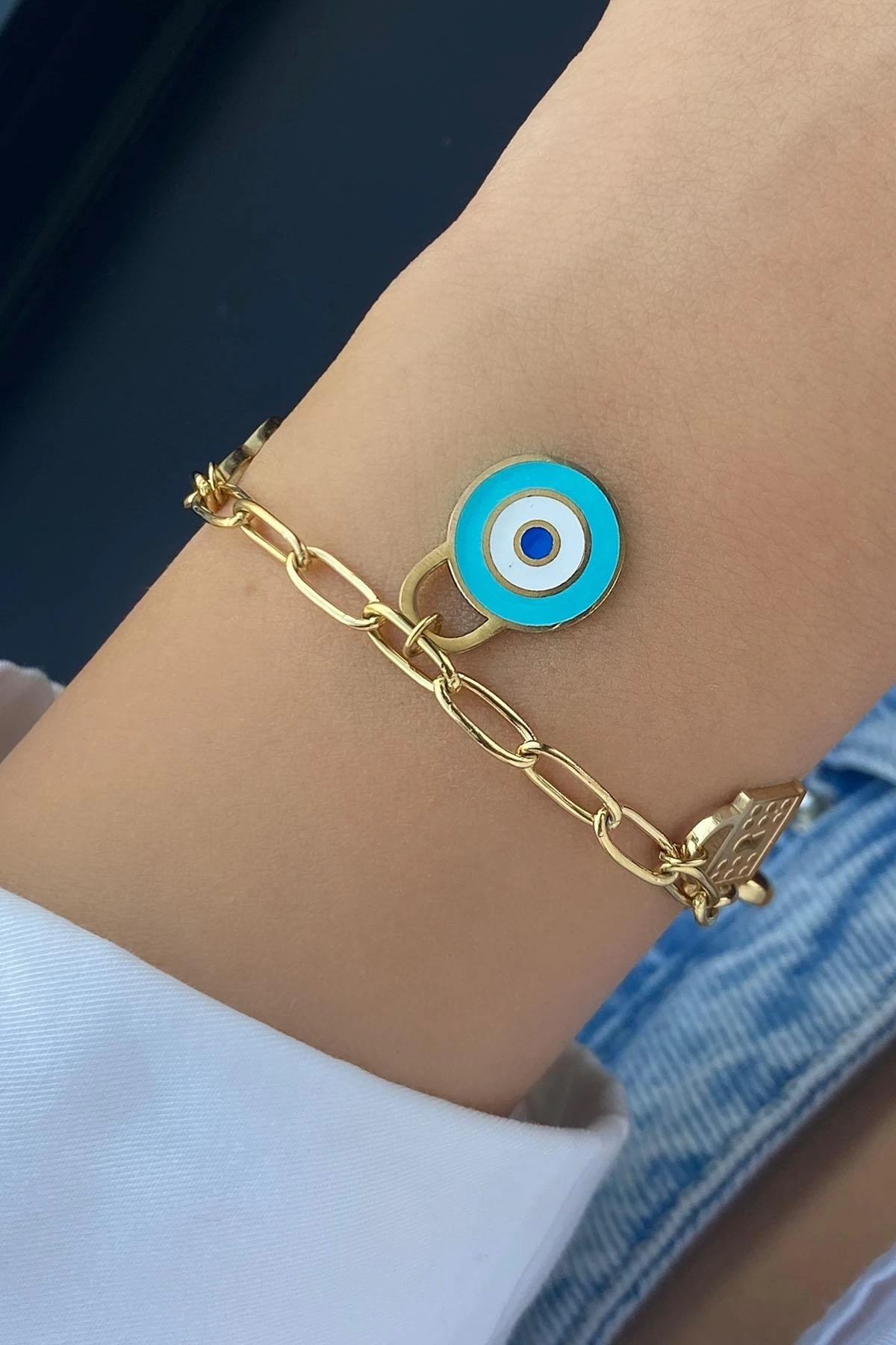 Altın Renk Göz Figürlü Taş Detaylı Çelik Kelepçe Bileklik