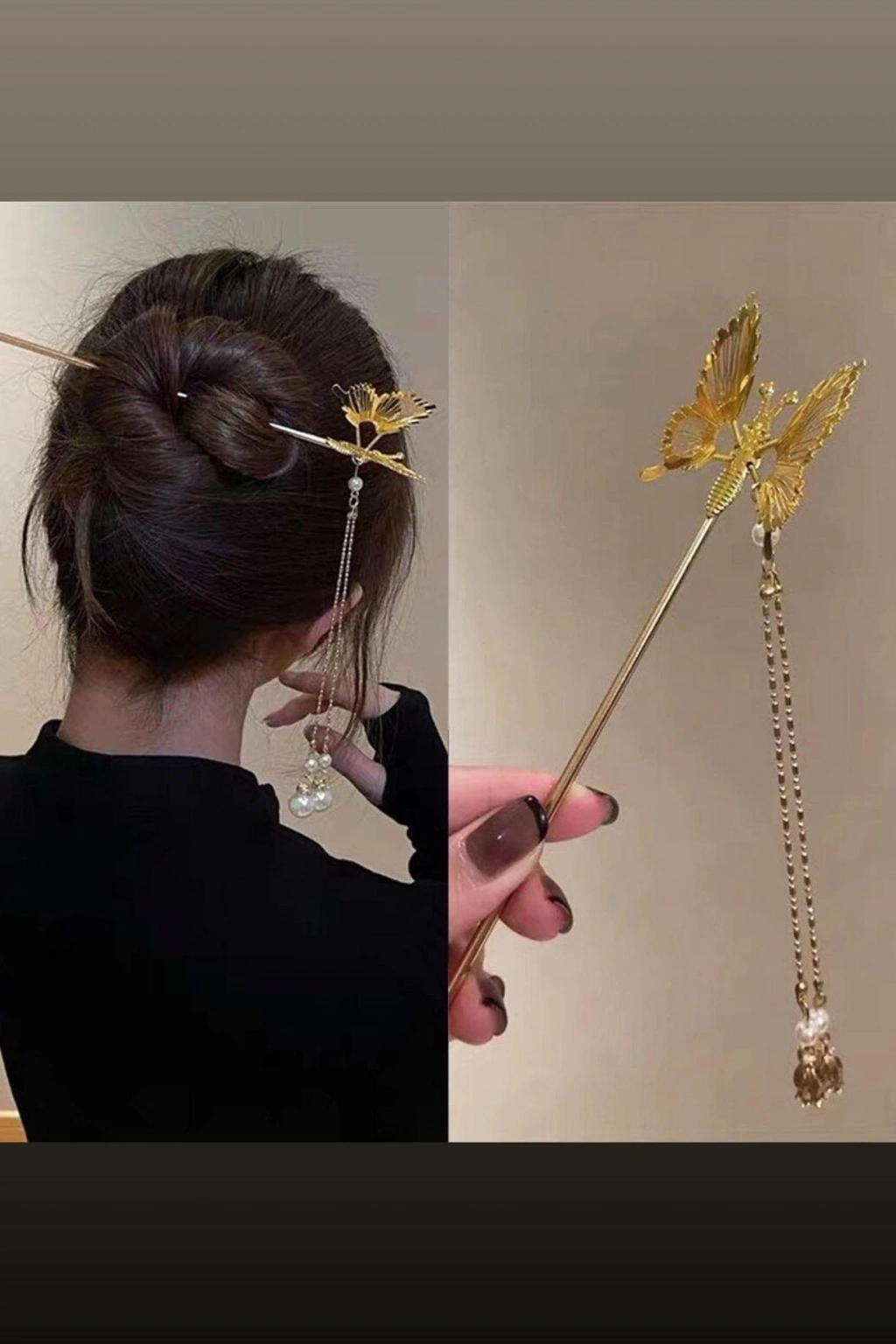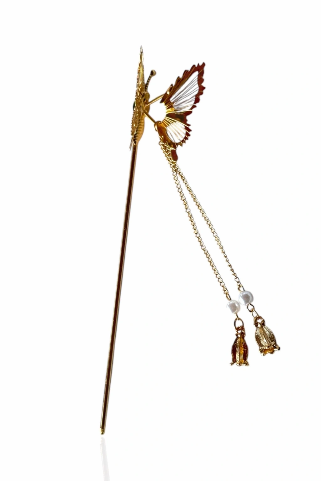 Altın Renk Kelebek Figürlü Sallantılı Topuz Tokası