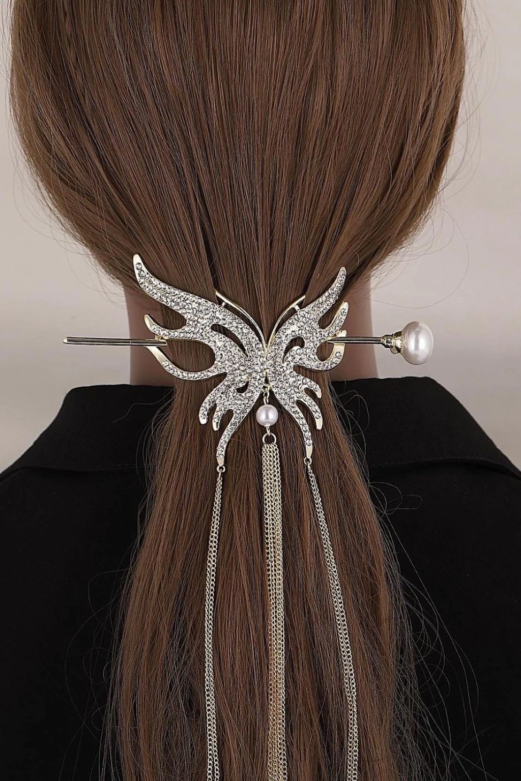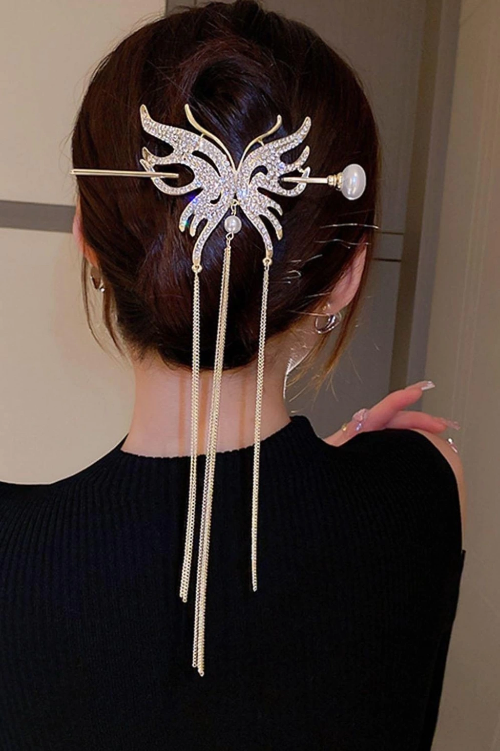 Altın Renk Kelebek Figürlü Taşlı Sallantılı Topuz Toka