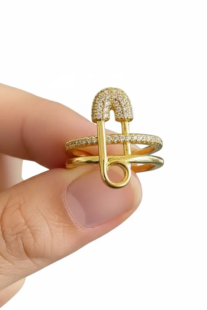 Altın Renk Kilitli İğne Figürlü 14K Altın Kaplama Ayarlanabilir Yüzük