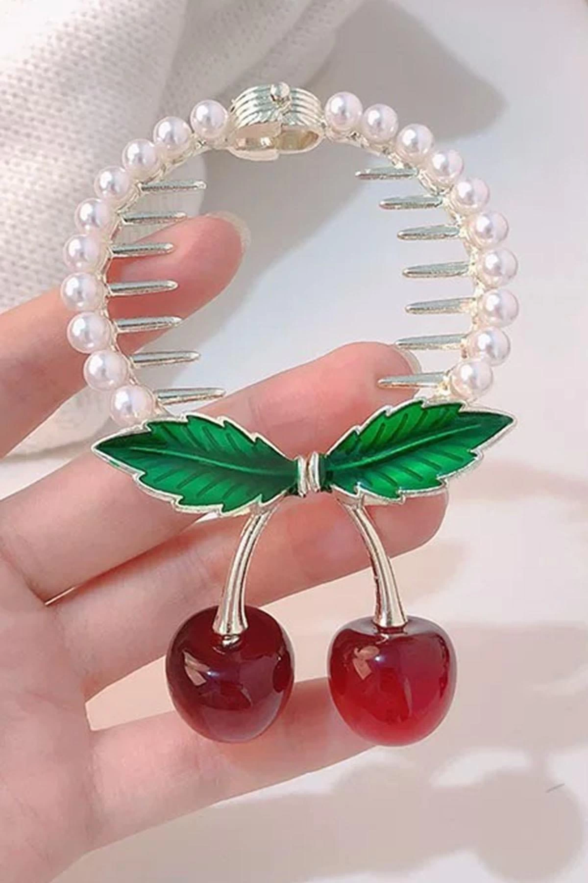 Altın Renk Kiraz Figürlü İnci Detaylı Sallantılı Topuz Tokası