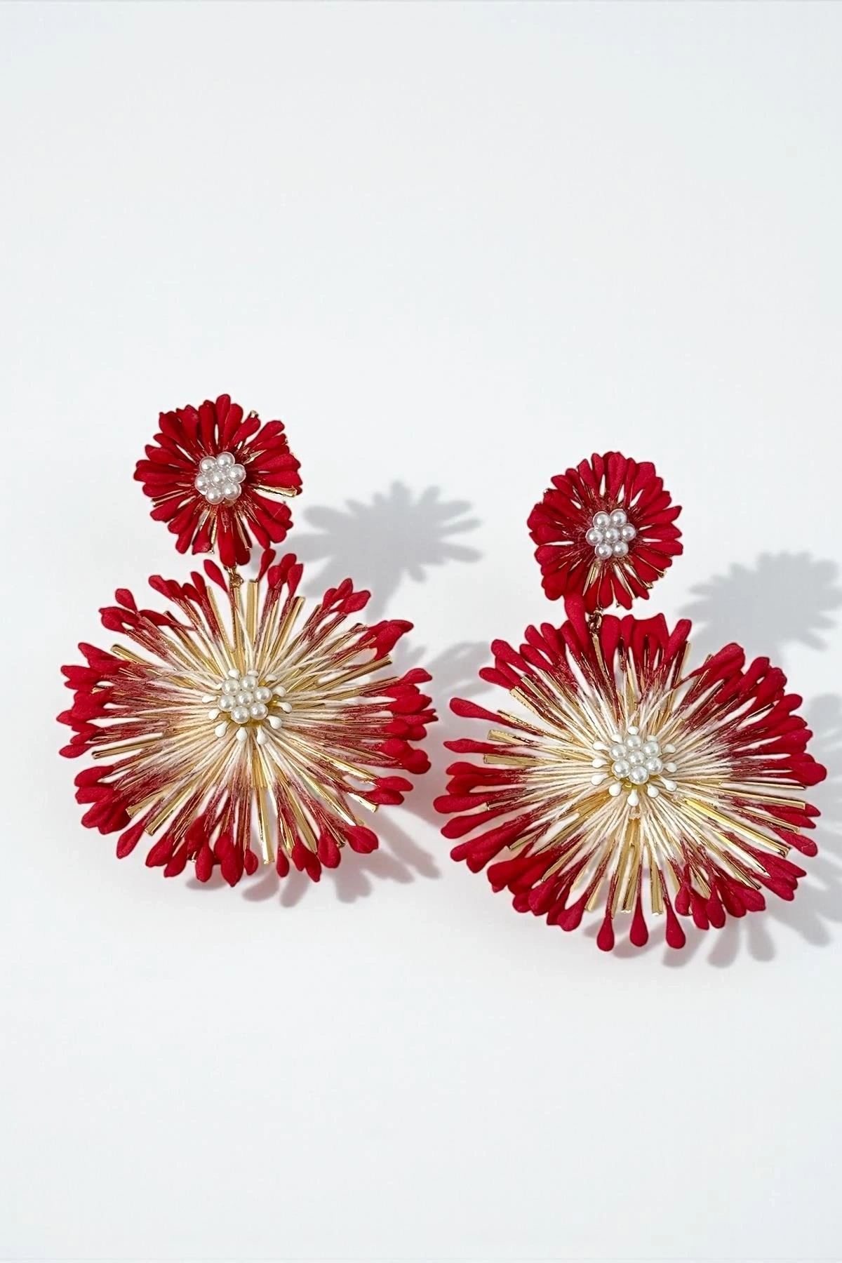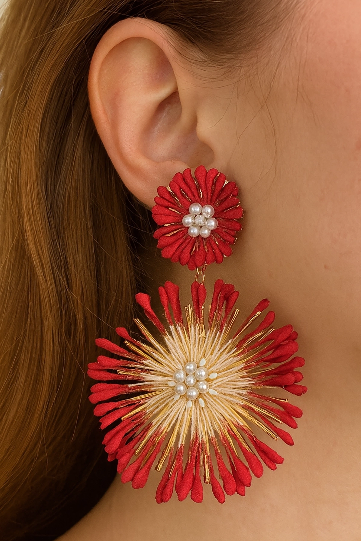 Altın Renk Kırmızı Çiçek Figürlü Tasarım Küpe (Çift)