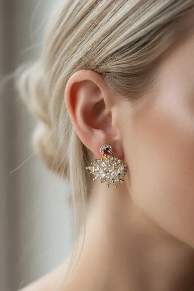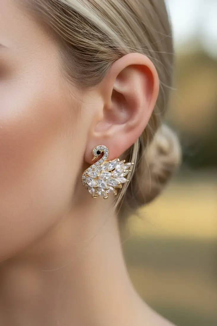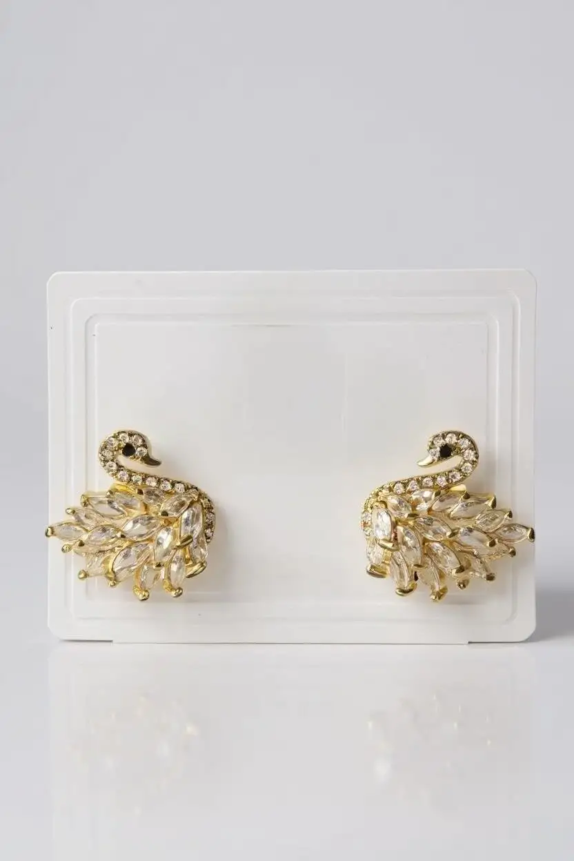 Altın Renk Kuğu Figürlü 14K Altın Kaplama Taş Detaylı Küpe (Çift)