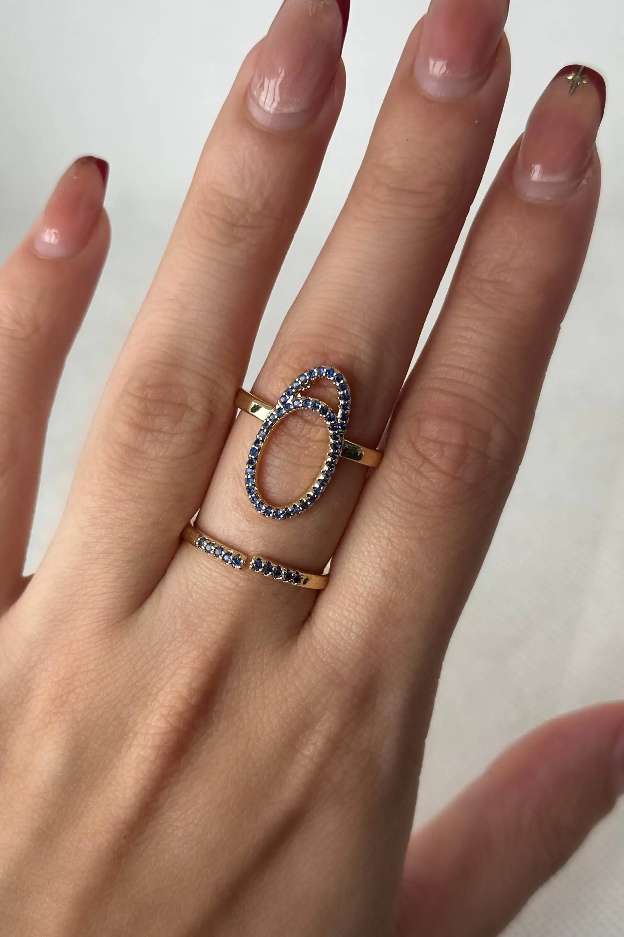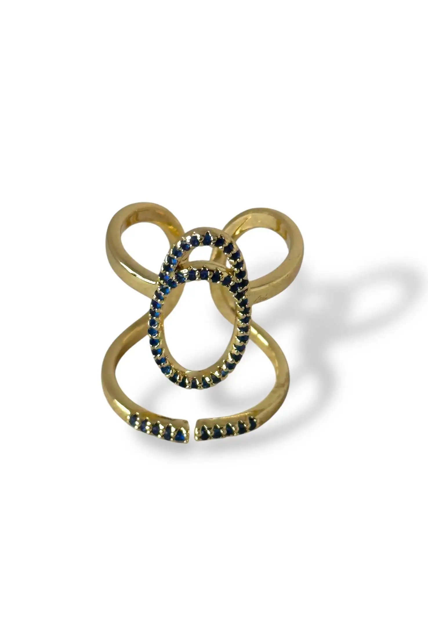 Altın Renk Lacivert Taş Detaylı Ayarlanabilir Çelik Yüzük