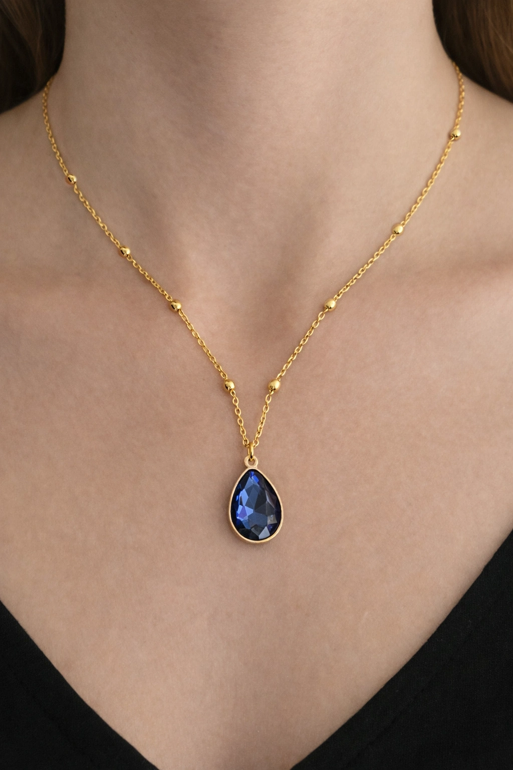 Altın Renk Lacivert Taş Detaylı Çelik Kolye