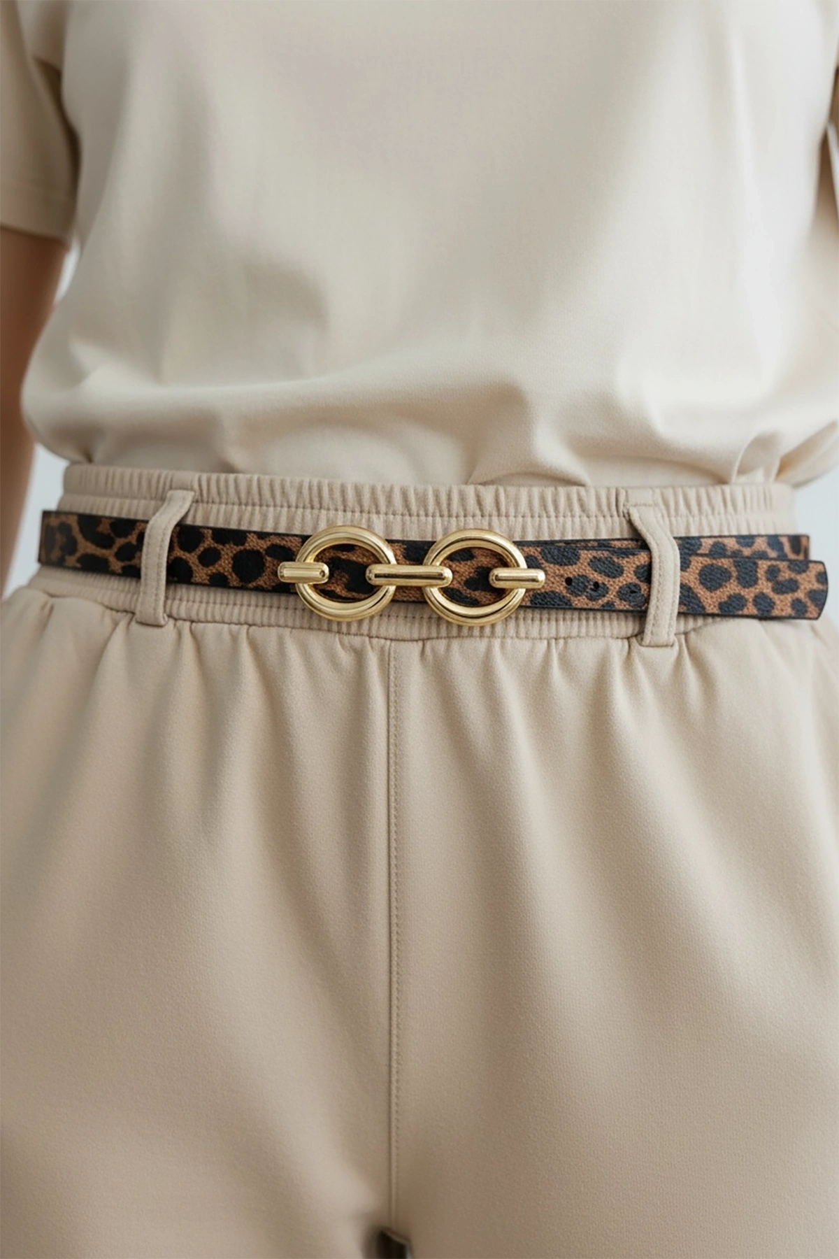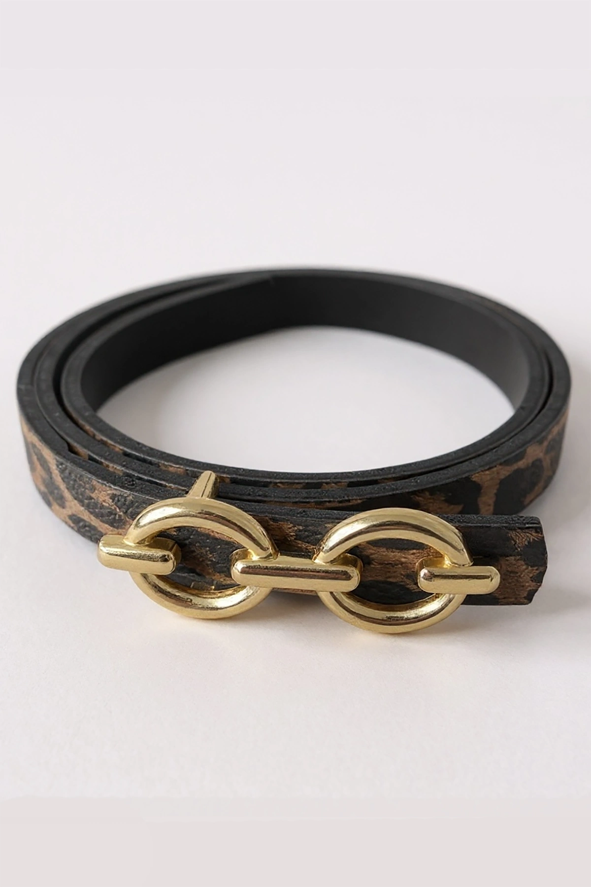 Altın Renk Leopar Desenli Kadın Deri Kemer