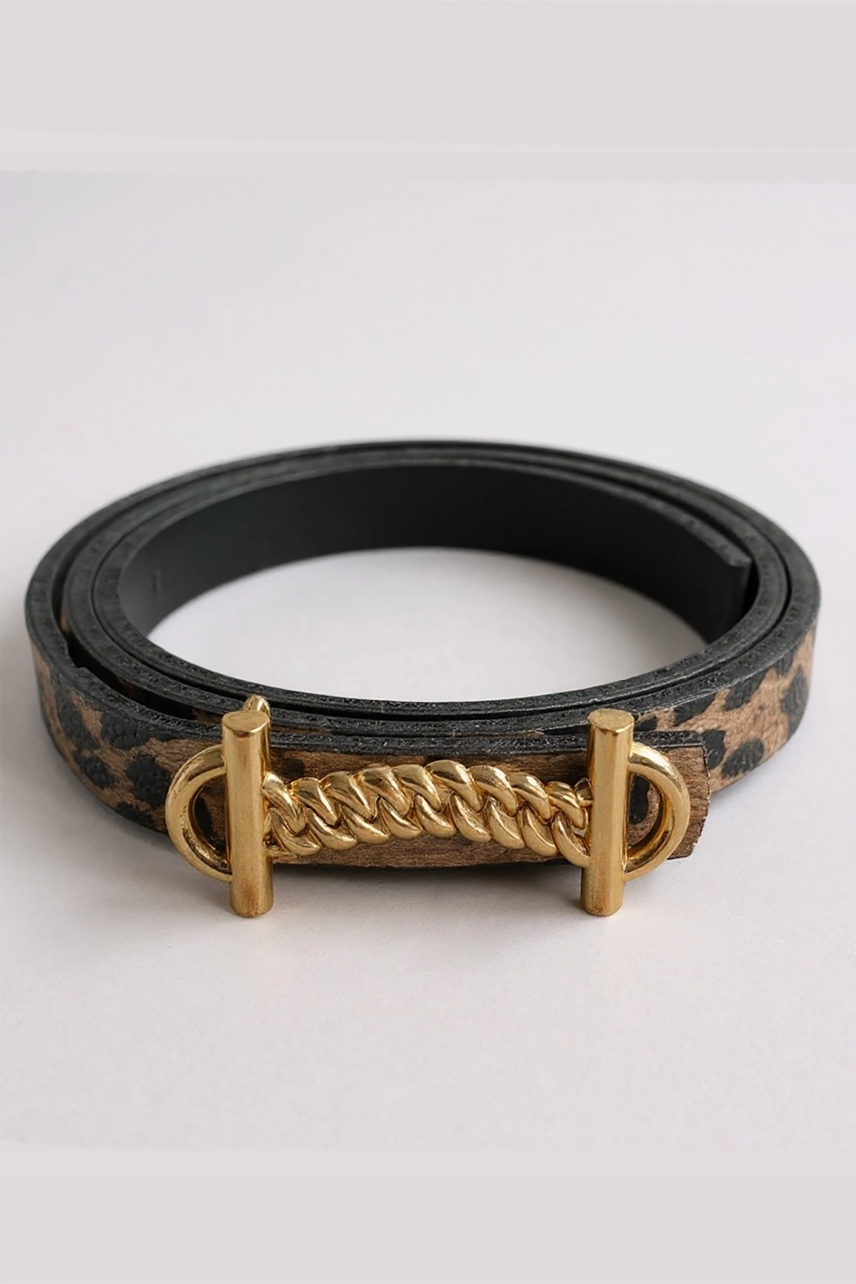 Altın Renk Leopar Desenli Kadın Deri Kemer