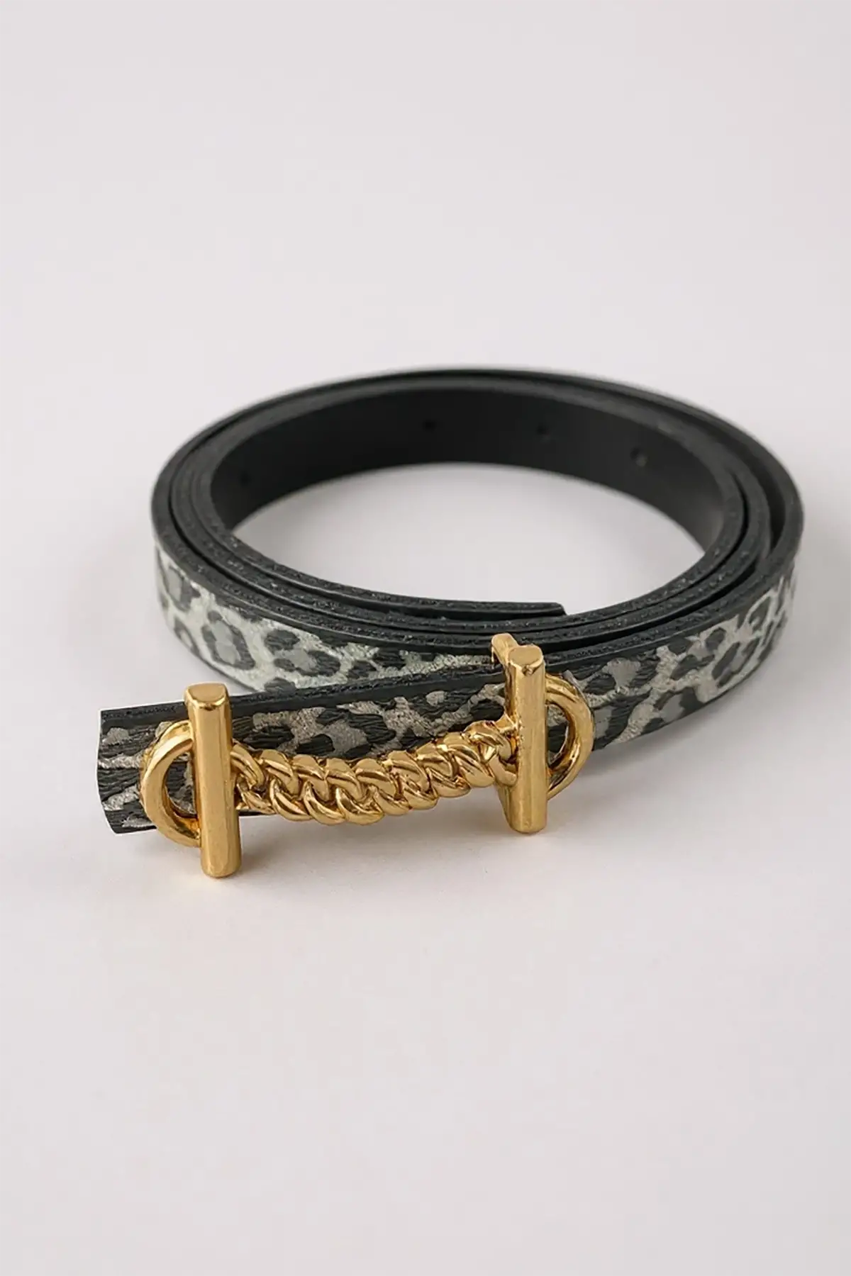 Gümüş Renk Leopar Desenli Kadın Deri Kemer