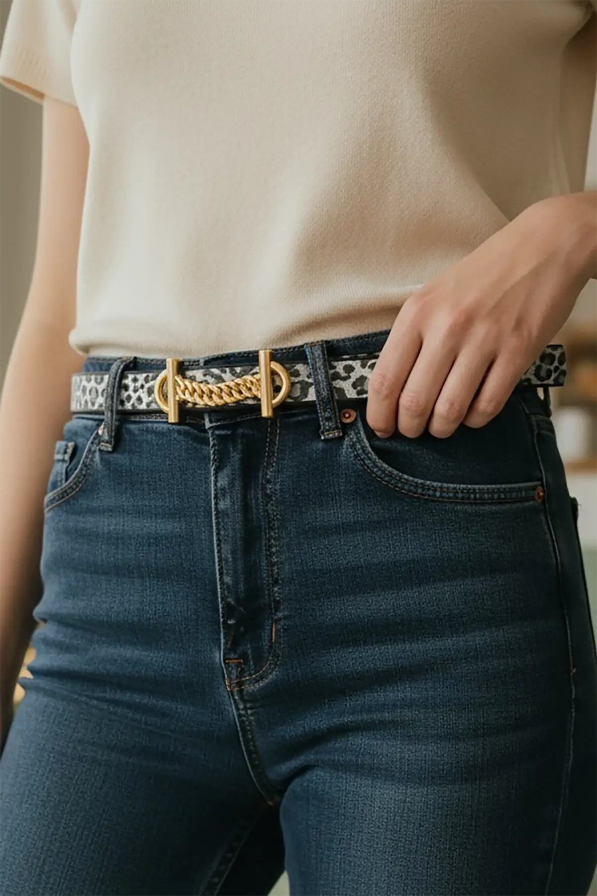 Altın Renk Leopar Desenli Kadın Deri Kemer