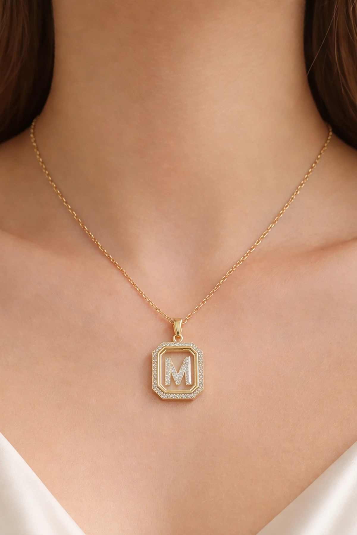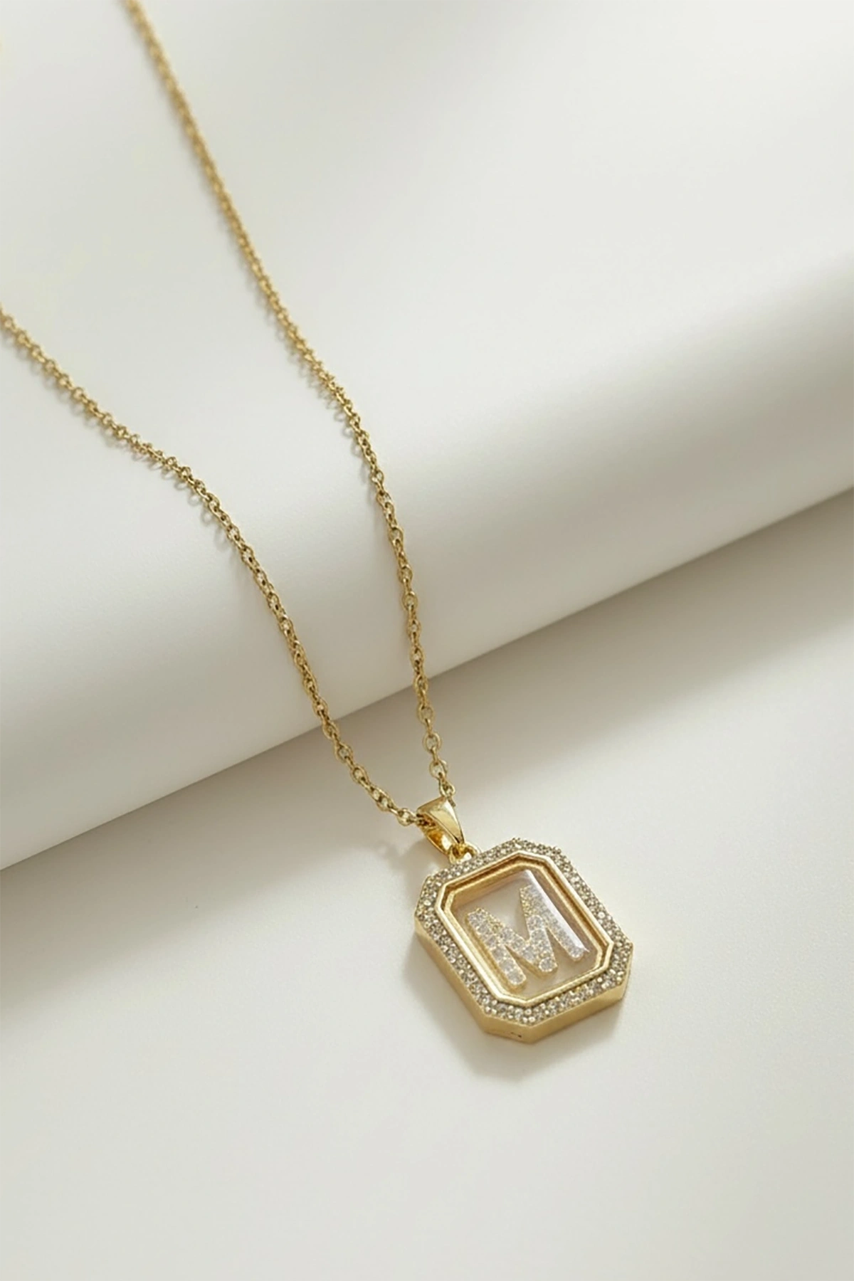 Altın Renk M Harf Taş Detaylı Çelik Kolye
