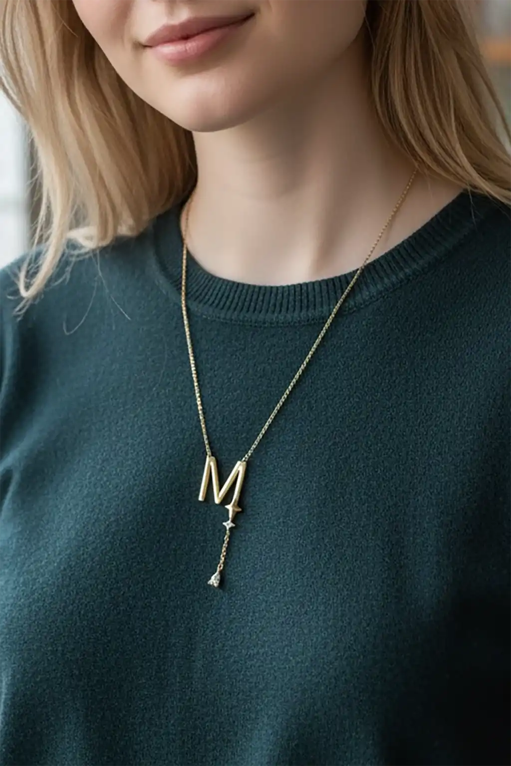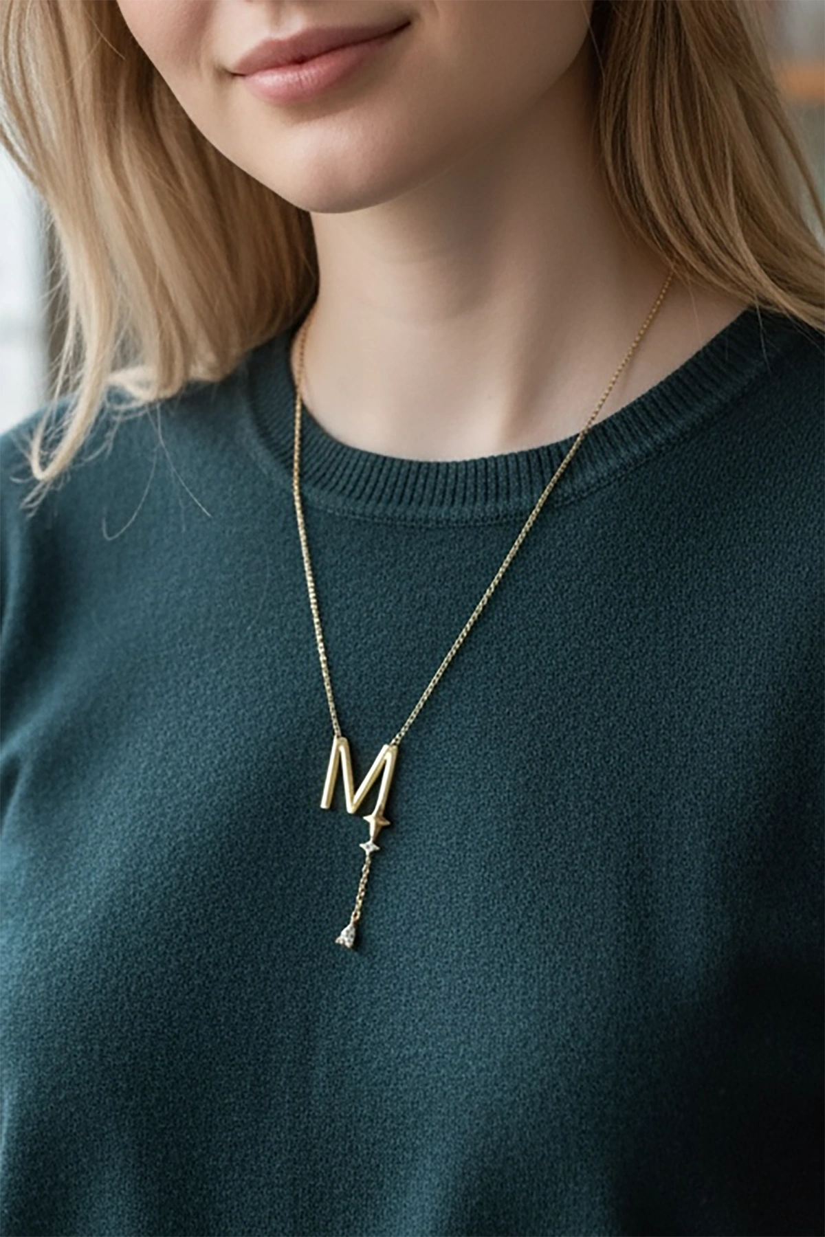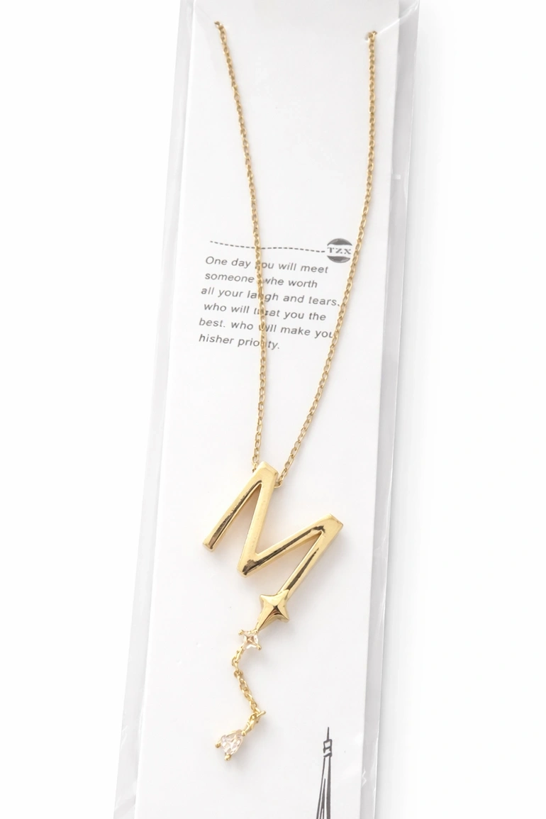 Altın Renk M Harfli Taş Detaylı Çelik Kolye