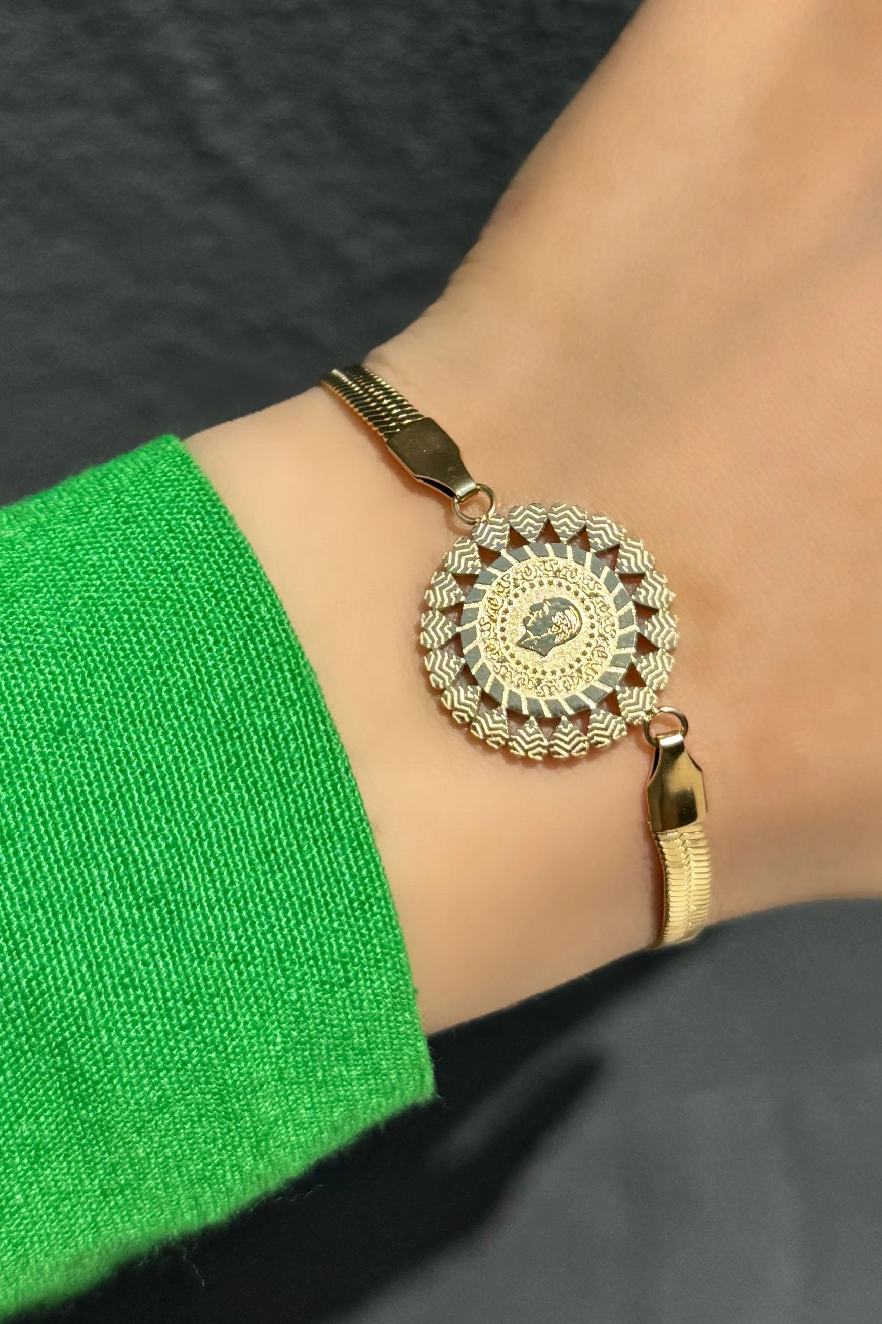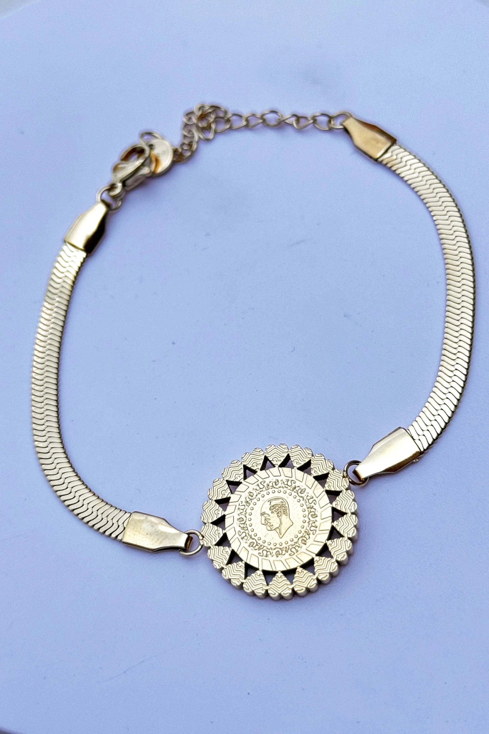 Altın Renk Madalyon Detaylı Çelik Bileklik