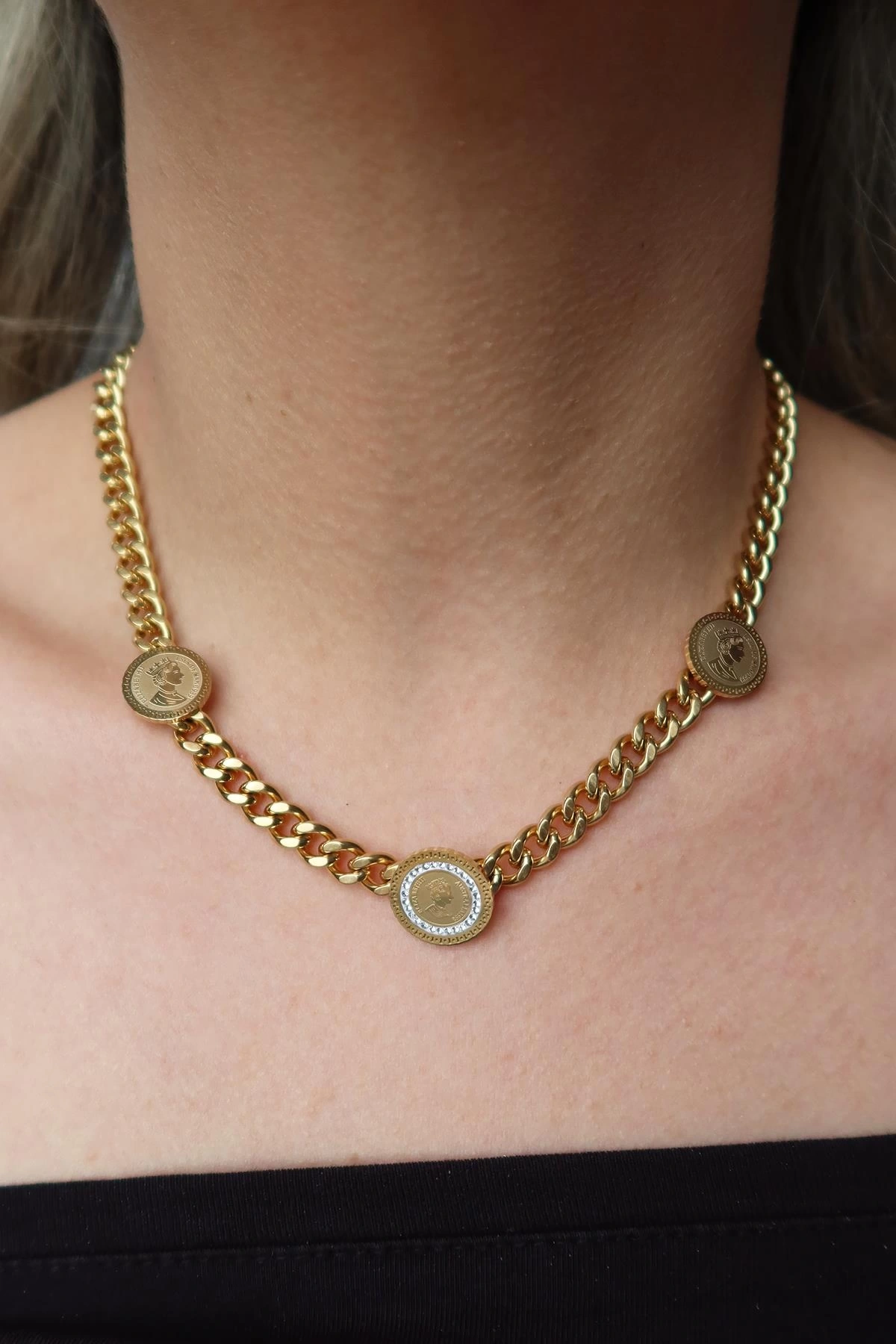 Altın Renk Madalyon Detaylı Çelik Kolye