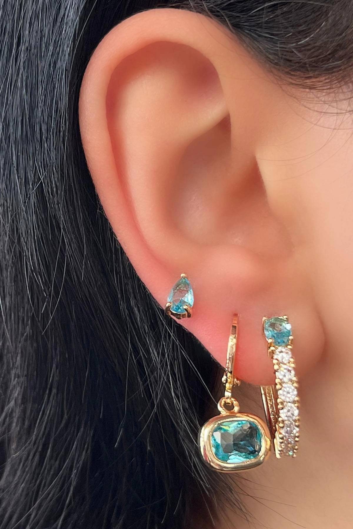 Altın Renk Mavi Taş Detaylı 3'lü YSX Küpe Set
