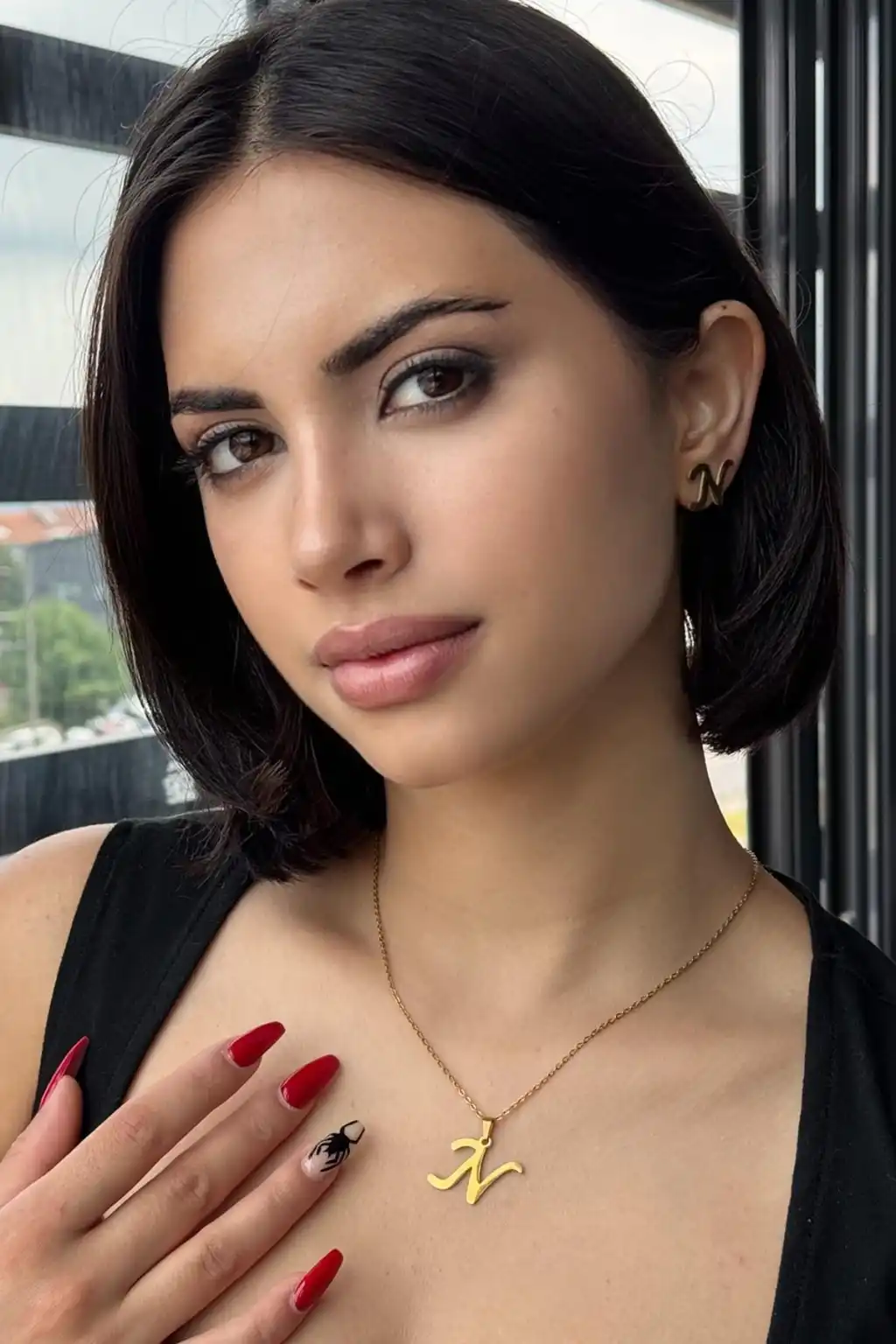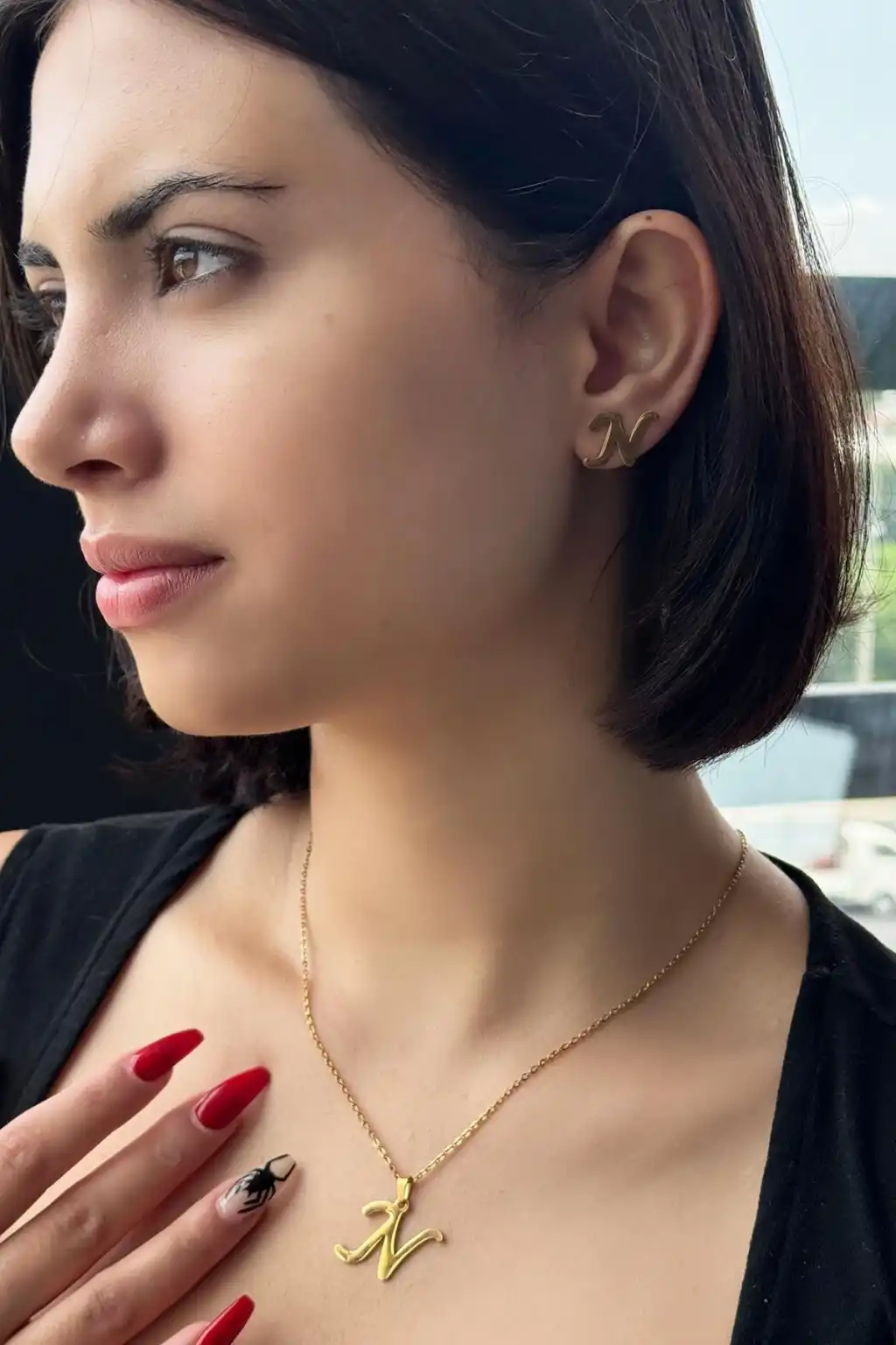 Altın Renk N Harf Figürlü Küpe Ve Kolye Set
