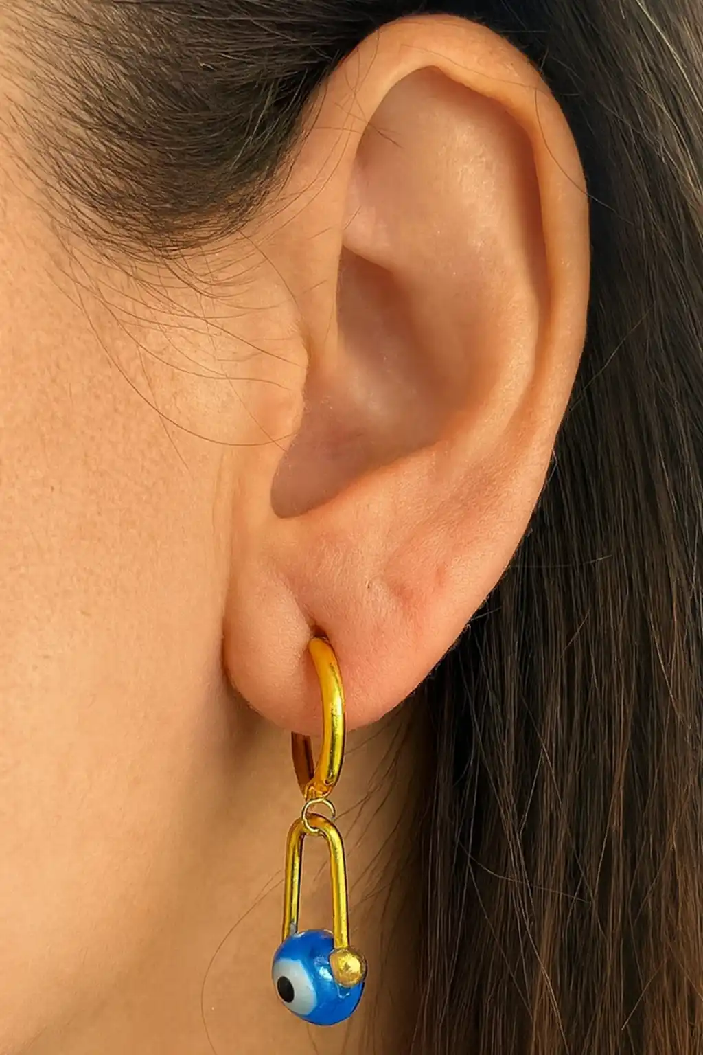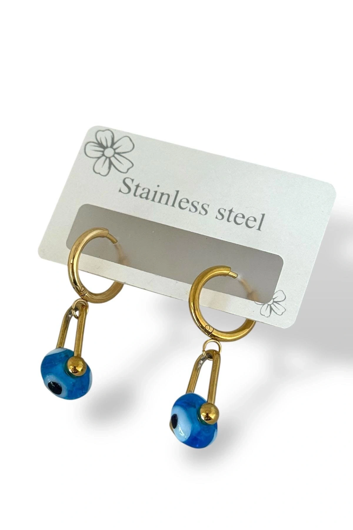 Altın Renk Nazar Boncuk Figürlü Çelik Küpe (Çift)
