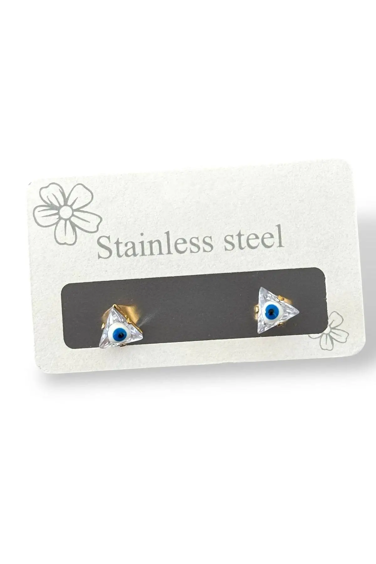 Altın Renk Nazar Boncuk Figürlü Taş Detaylı Çelik Küpe (Çift)