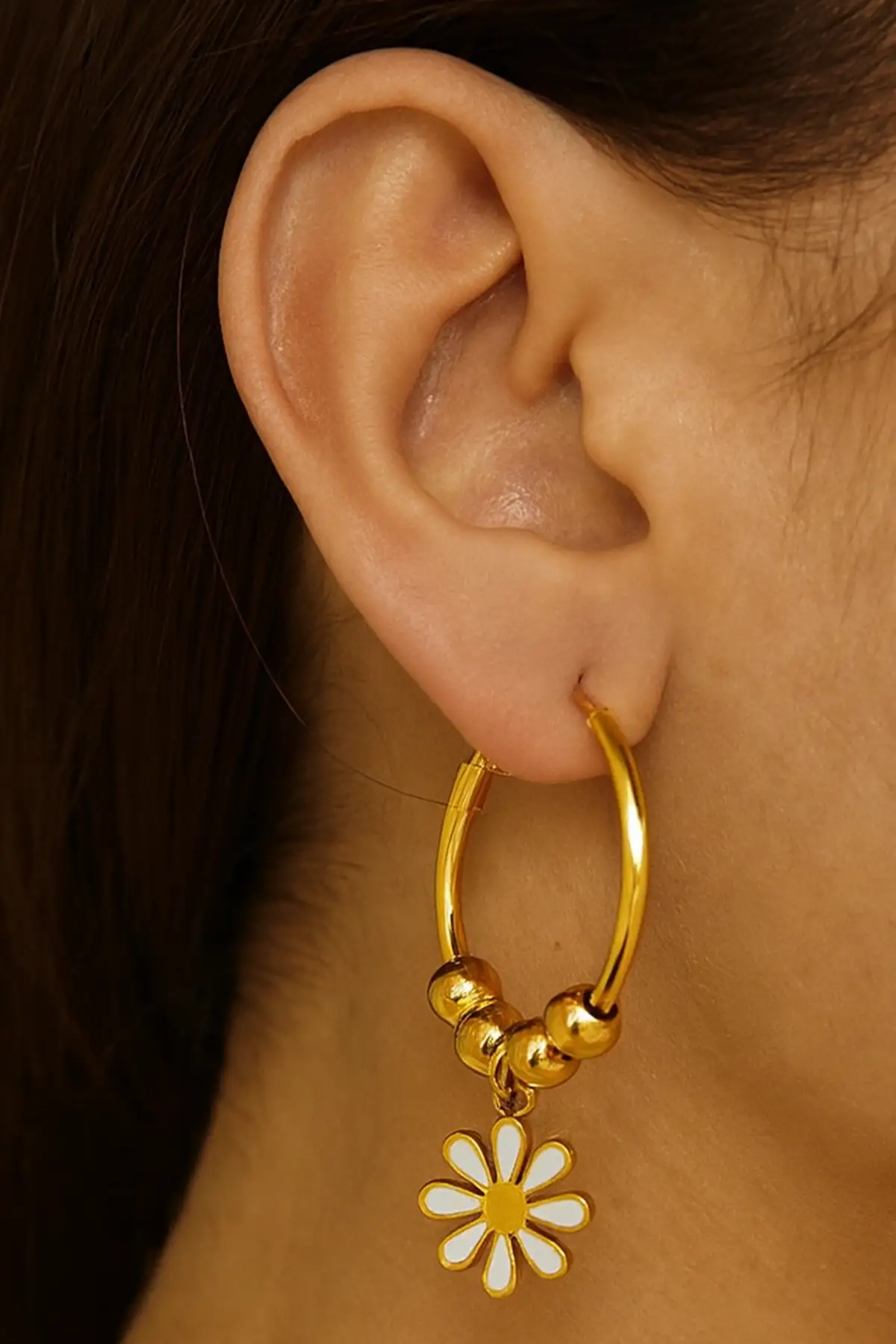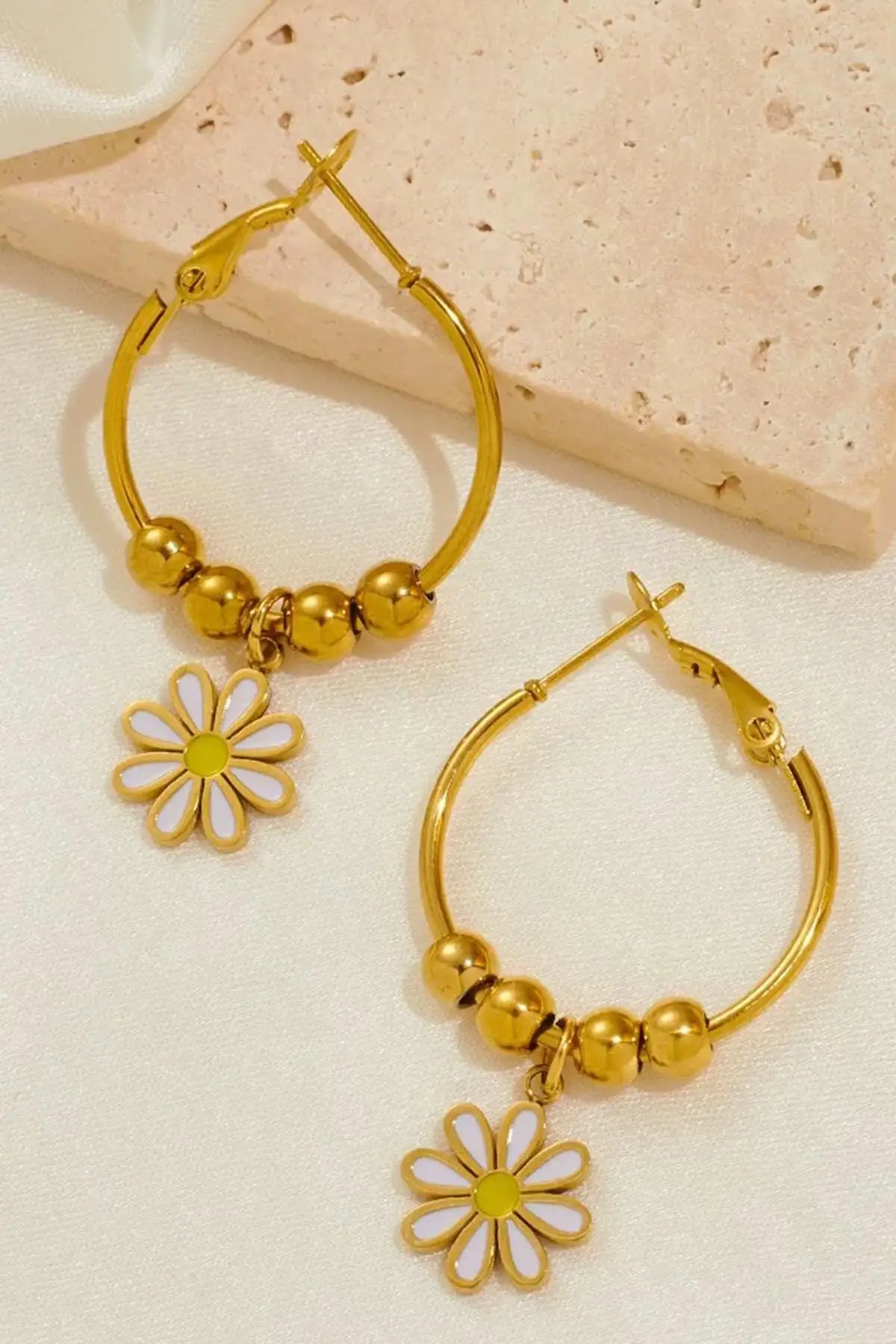Altın Renk Papatya Figürlü Çelik Halka Küpe (Çift)