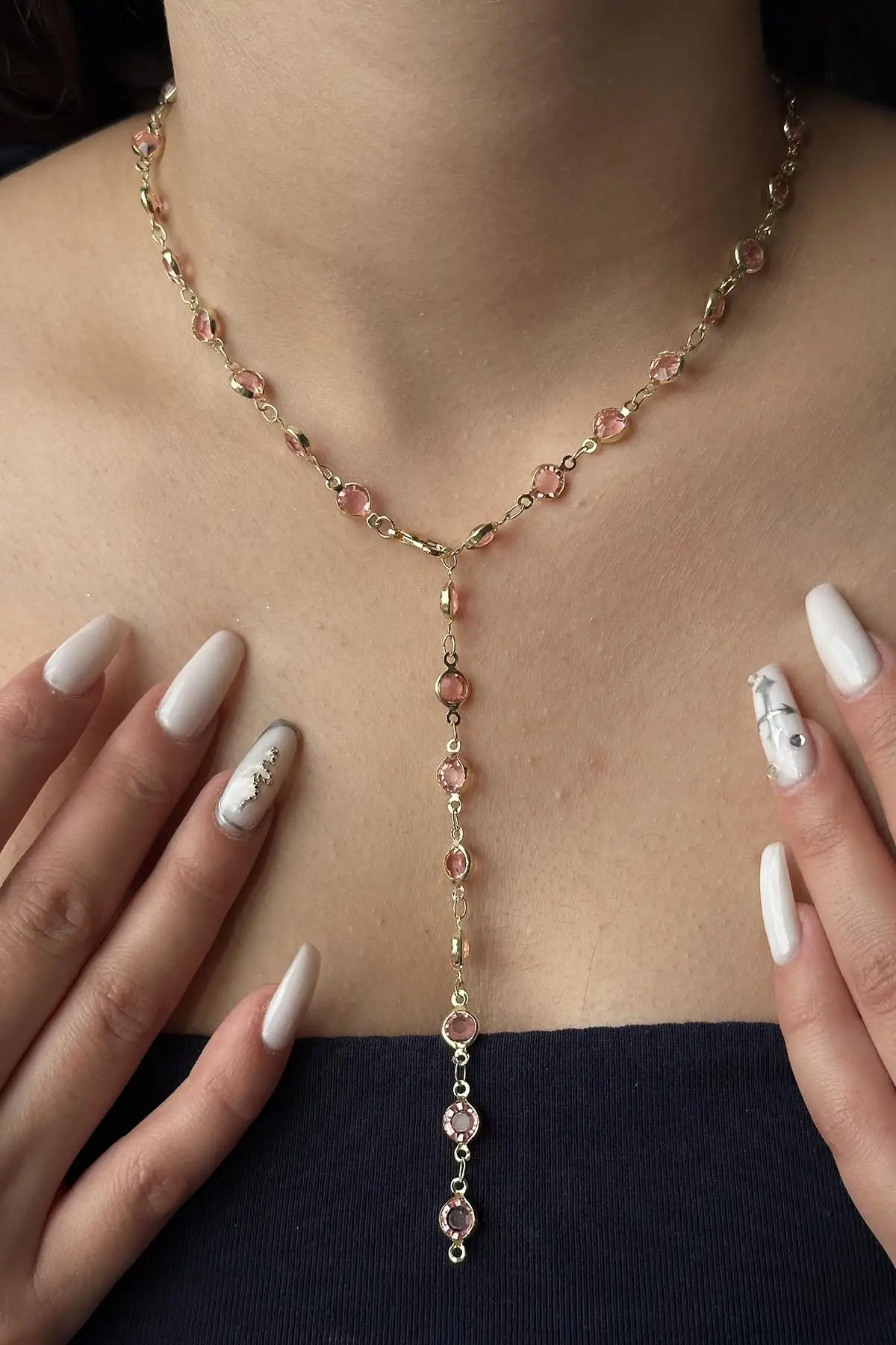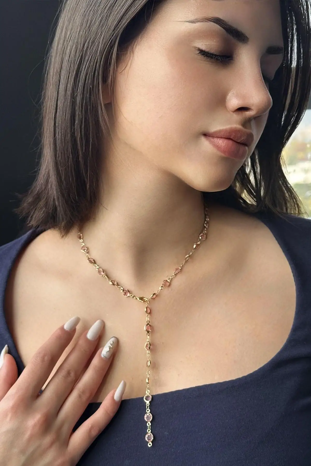 Altın Renk Pembe Taş Detaylı Çelik Y Kolye