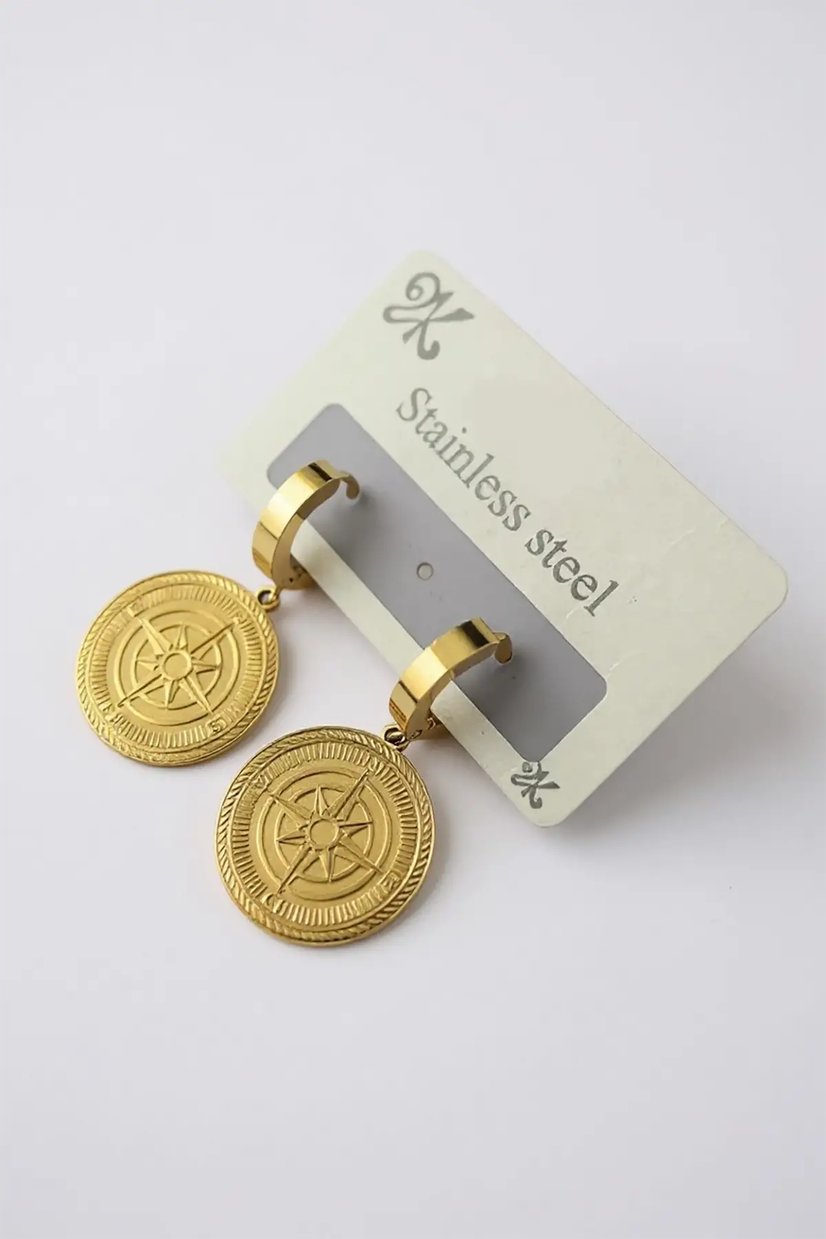 Altın Renk Pusula Figürlü Çelik Küpe (Çift)