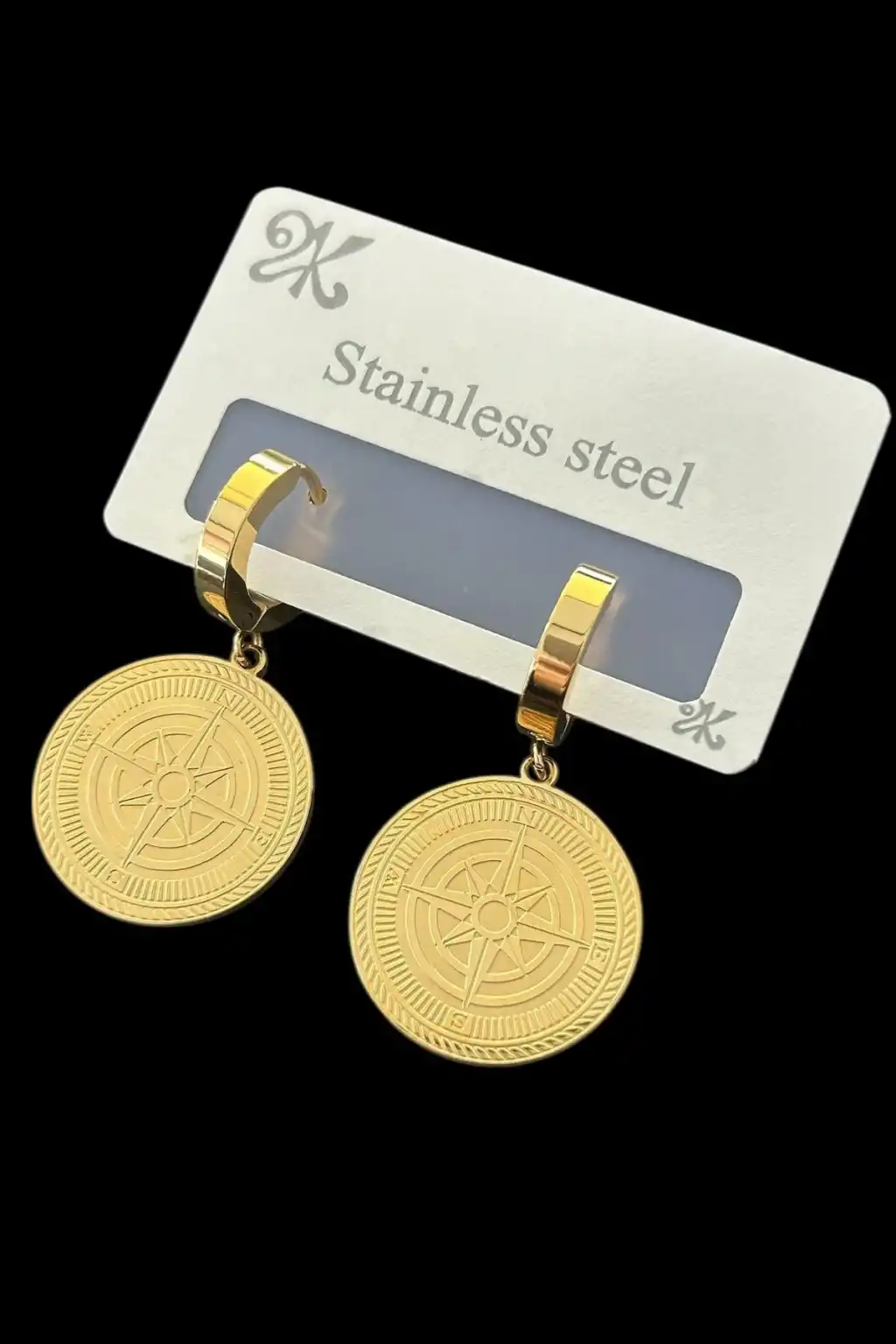 Altın Renk Pusula Figürlü Çelik Küpe (Çift)