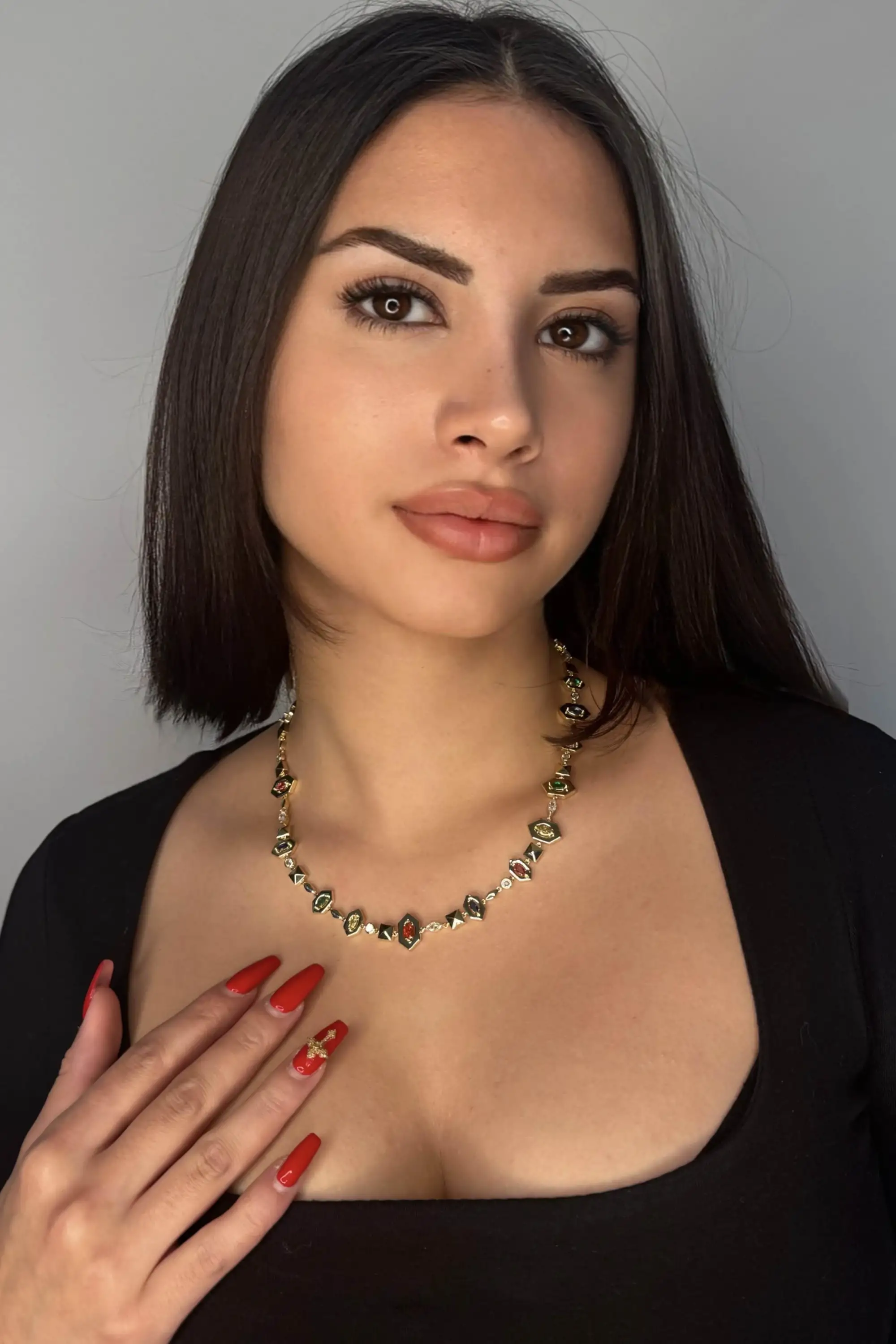 Altın Renk Renkli Taş Detaylı 14K Altın Kaplama VİP Kolye