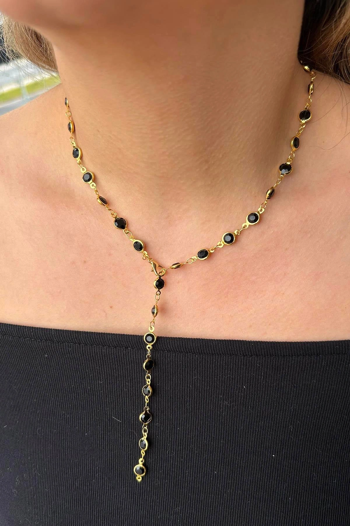 Altın Renk Siyah Taşlı Çelik Y Kolye