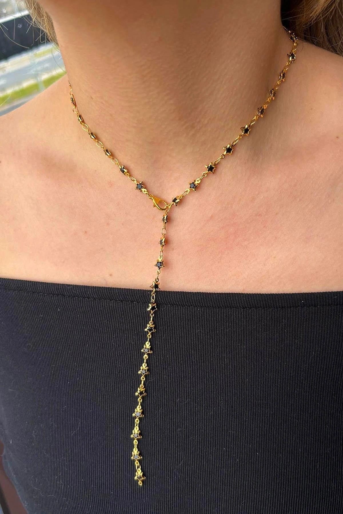 Altın Renk Siyah Taşlı Yıldız Figürlü Çelik Y Kolye