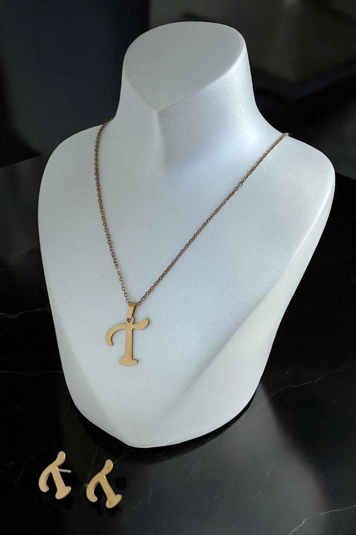 Altın Renk T Harfli Çelik Kolye Ve Küpe Set