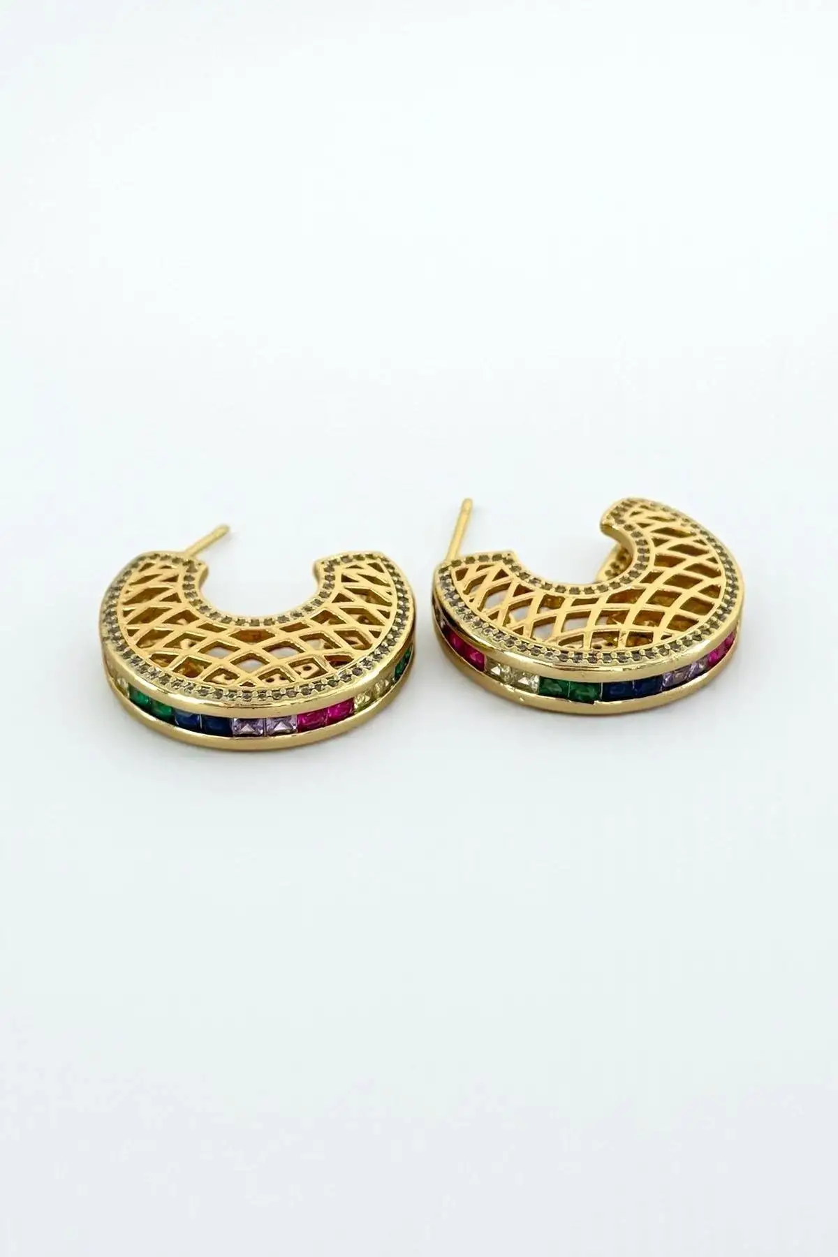 Altın Renk Taş Detaylı 14K Altın Kaplama TX Halka Küpe (Çift)