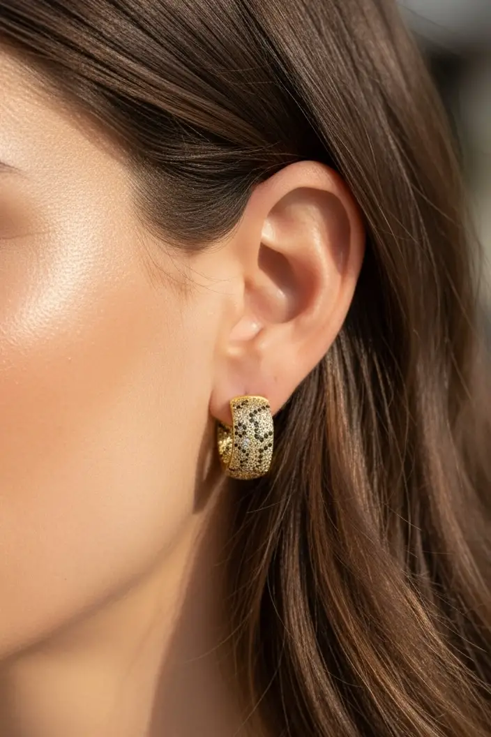 Altın Renk Taş Detaylı 14K Altın Kaplama Halka Küpe (Çift)