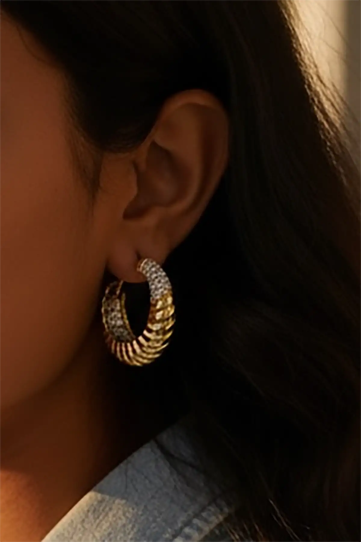 Gümüş Renk Taş Detaylı Halka Küpe (Çift)